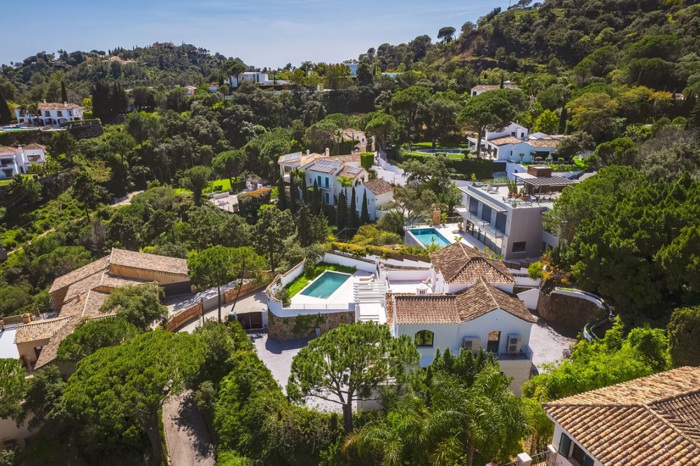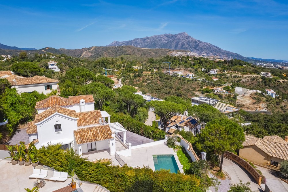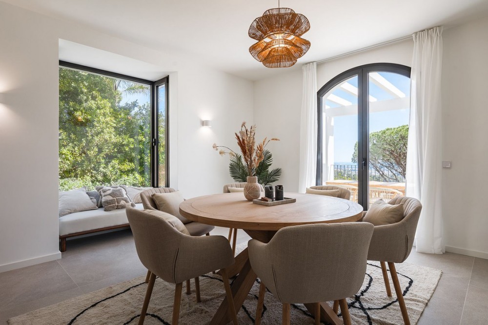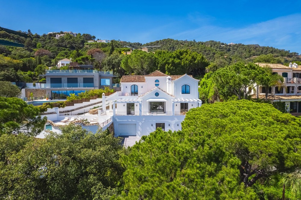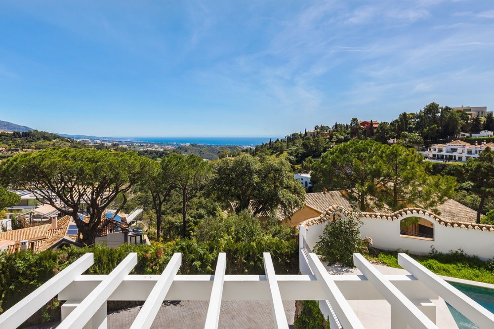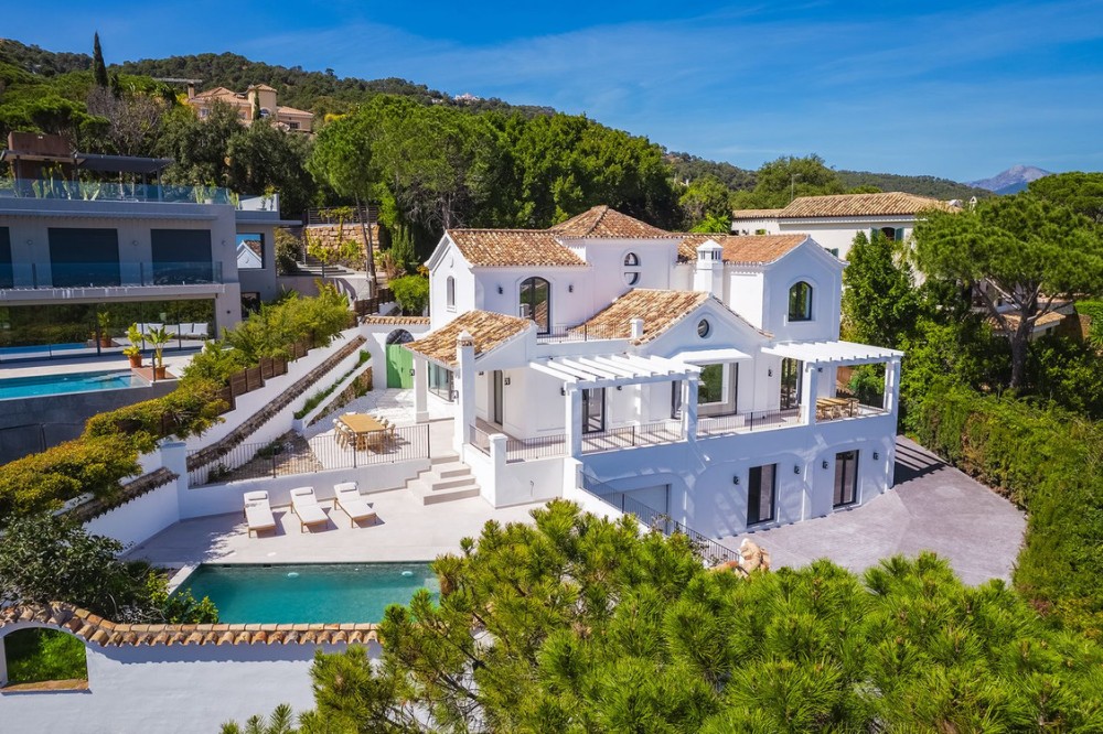 - This elegantly renovated luxury villa offers a refined lifestyle within an exclusive, secure gated complex. Enjoying a desirable south to south- east orientation, the property boasts breathtaking sea views and abundant natural light throughout the day. The villa features five spacious bedrooms and five well-appointed bathrooms, providing ample space and comfort for both family and guests. The fully fitted eat-in kitchen combines functionality with style, ideal for casual dining, while a separate formal dining room offers an inviting setting for entertaining. The main living room provides a comfortable and stylish space to relax, complemented by a versatile entertainment room that can be adapted to suit a range of leisure activities. The home is equipped with underfloor heating throughout, as well as hot and cold air conditioning, ensuring year-round comfort. Outside, the private garden and swimming pool create a tranquil retreat, perfect for both quiet moments and social gatherings. Additional features include a generous driveway with access to a two-car garage, offering convenience and security. Situated in a gated urbanisation, the property guarantees peace of mind and a high level of privacy. The villa is sold fully furnished, allowing for a seamless transition and immediate enjoyment. Viewings are highly recommended to truly appreciate the quality, comfort, and stunning setting of this exceptional home. El Madroñal is only 2 minutes drive to Monte Halcones Commercial centre with its cafes, supermarket and shops, and a further 5 minutes to San Pedro Town and the beach.
