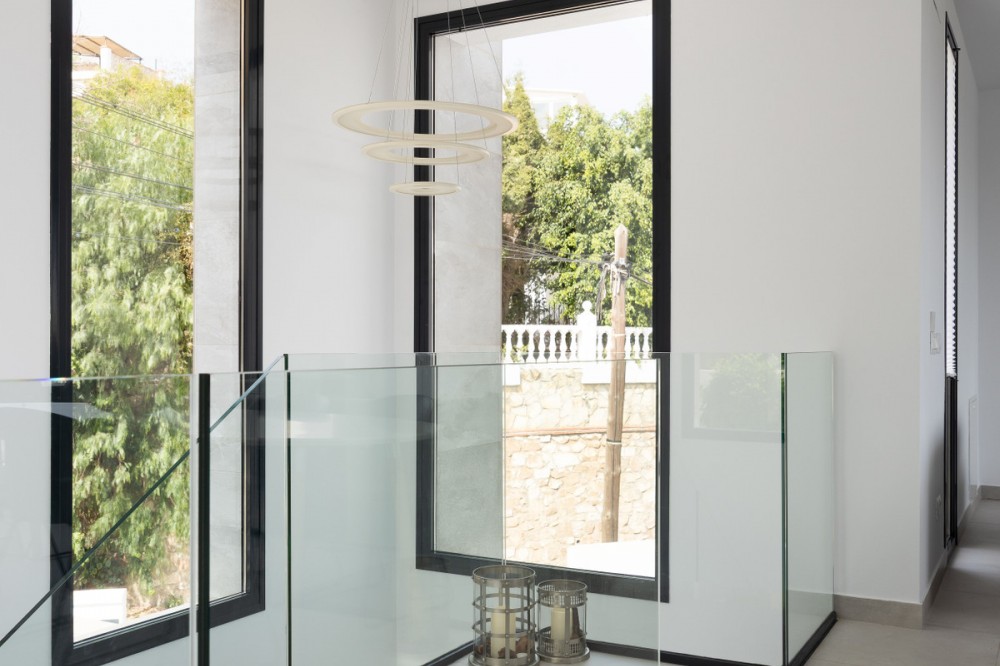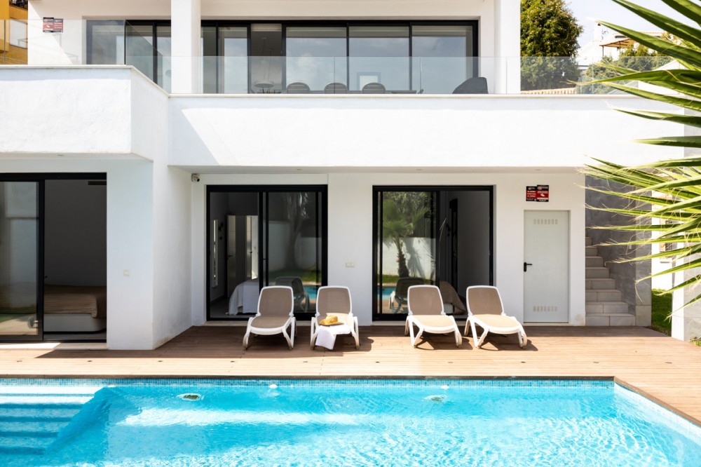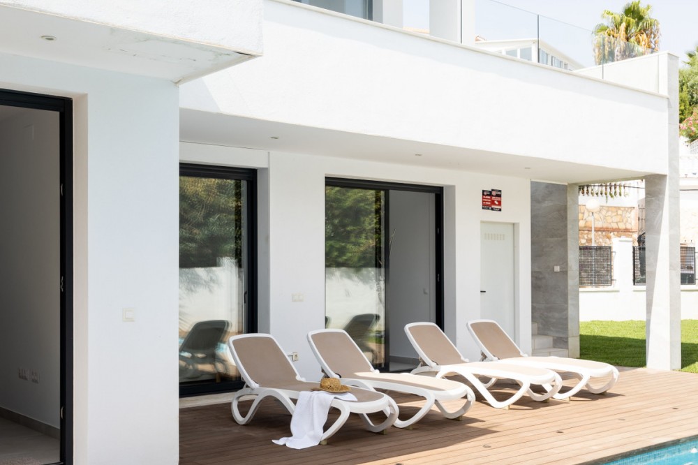 - This exclusive luxury villa, combines modern architecture with top-quality construction and a carefully designed layout. The home is filled with natural light thanks to large floor-to-ceiling windows in every room, creating a harmonious sense of space and elegance. The villa is equipped with the latest smart home technology, allowing you to easily control temperature and functions via a central unit or app. Underfloor heating throughout the property and solar panels ensure year-round comfort and an energy-efficient lifestyle. On the ground floor, you will find three spacious bedrooms, all with direct access to the terrace and pool area. The master bedroom features a luxurious en-suite bathroom and a generous walk-in closet. The upper floor impresses with an open-plan design, a state-of-the-art kitchen of the highest standard, and a bright living room. From here, you can access the large terrace, perfect for social gatherings with a dining area, lounge space, and barbecue, as well as partial sea views. The private garden offers a well-kept lawn, a swimming pool, and plenty of space for relaxation or family activities. The property also includes two parking spaces. The location is ideal, close to all amenities, the beach, and Torreblanca train station, which is just a few minutes away. You are most welcome to contact us for more information or to arrange a private viewing.