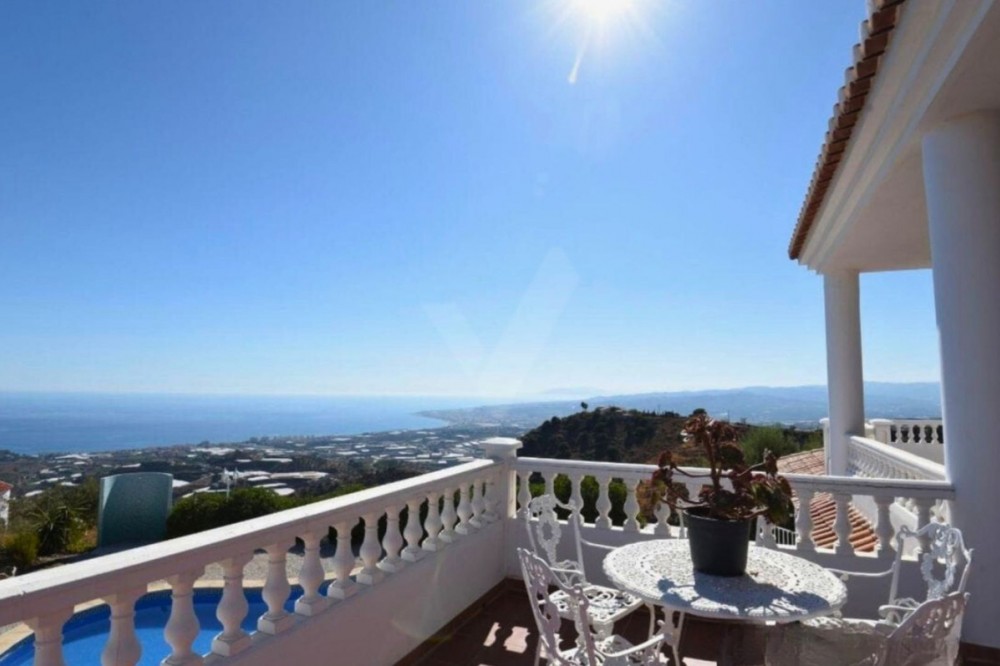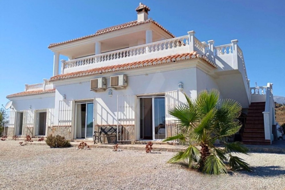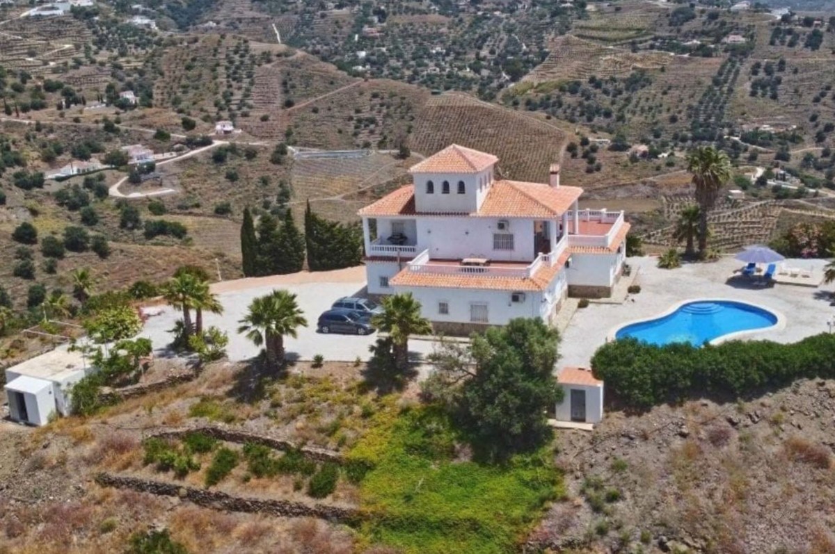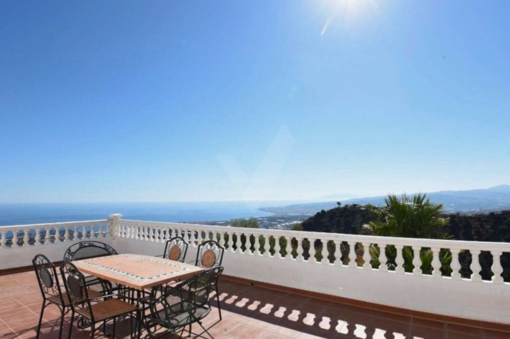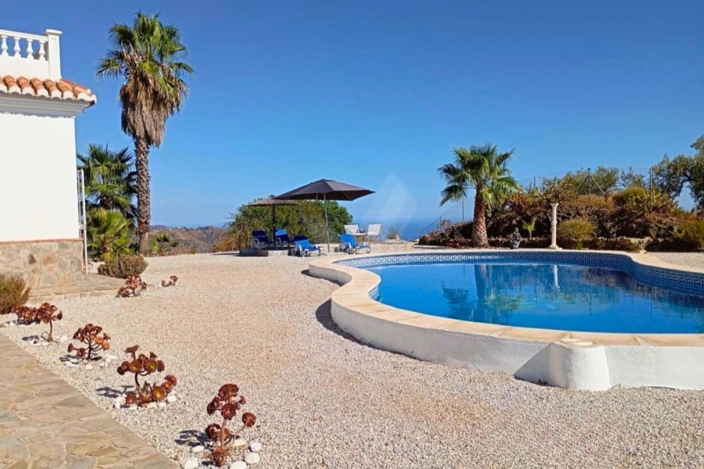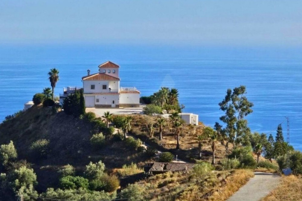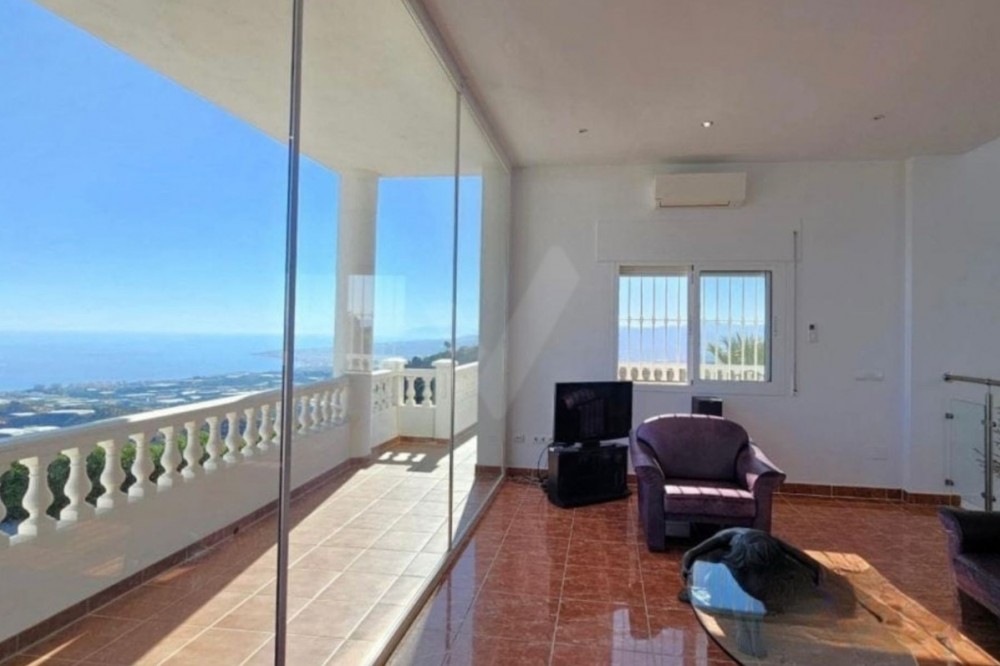 - Exceptional Hilltop Villa with Panoramic Views This exceptional villa, built in 2002, was designed with great refinement to provide the elegance and grandeur it deserves, perched at the top of a hill. It is a unique property, unmatched in the area. Ground Floor At the entrance, you are welcomed by a spacious hall that leads to four large bedrooms, ranging from 16 to 32 m². Each bedroom has its own en-suite bathroom and generous built-in wardrobes, ensuring comfort and ample storage space. All ground-floor rooms have direct access to the pool area. On this level, you will also find: a secondary kitchen, practical for occasional use, a technical and storage room, and the villa’s garage. Upper Floor The main highlight of the house is, without a doubt, the magnificent marble spiral staircase, a valuable feature that ascends to the upper floor. From here, you are greeted with breathtaking views of the entire eastern coast of Málaga and the Mediterranean Sea, in a 180° panoramic angle. The upper floor hosts a spacious living room of almost 55 m², furnished with leather sofas and complemented by a spectacular glass table, supported by a bronze sculpture depicting a nude woman seated on a small cushion, holding the glass top in her hand and resting it on her knees. This rare piece, imported from Germany, is valued at several thousand euros. On the other side of the living room lies the dining area, followed by the fully equipped kitchen and, next to it, an additional guest bathroom. The entire upper floor is surrounded, in a U-shape, by impressive terraces of 35 m² and 43 m². These are ideal spaces for relaxation and leisure, offering stunning views of the Mediterranean Sea, the eastern coastline, and the mountains, in an environment of nature, tranquility, harmony, and an exclusive lifestyle. Land Features The property includes a plot of over 35,000 m², mostly sloping, which offers multiple possibilities to turn it into a profitable agricultural estate. It is ideal for cultivating exotic and tropical fruits such as avocado, mango, pitaya (dragon fruit), cherimoya, loquat, pomegranate, papaya, kumquat, prickly pear, among many others. This property represents an investment opportunity with immense potential, ensuring excellent profitability, in addition to the privilege of living in a luxurious villa, unique in the area. Location Nerja: 24 km Málaga: 46 km Málaga Airport: 57 km ✨ A spectacular villa with dreamlike panoramic views, luxury finishes, and a vast plot — perfectly combining exclusivity, the tranquility of nature, and extraordinary investment potential.