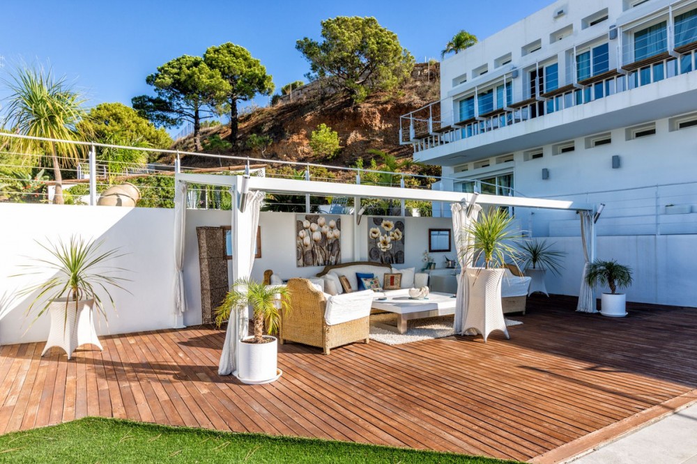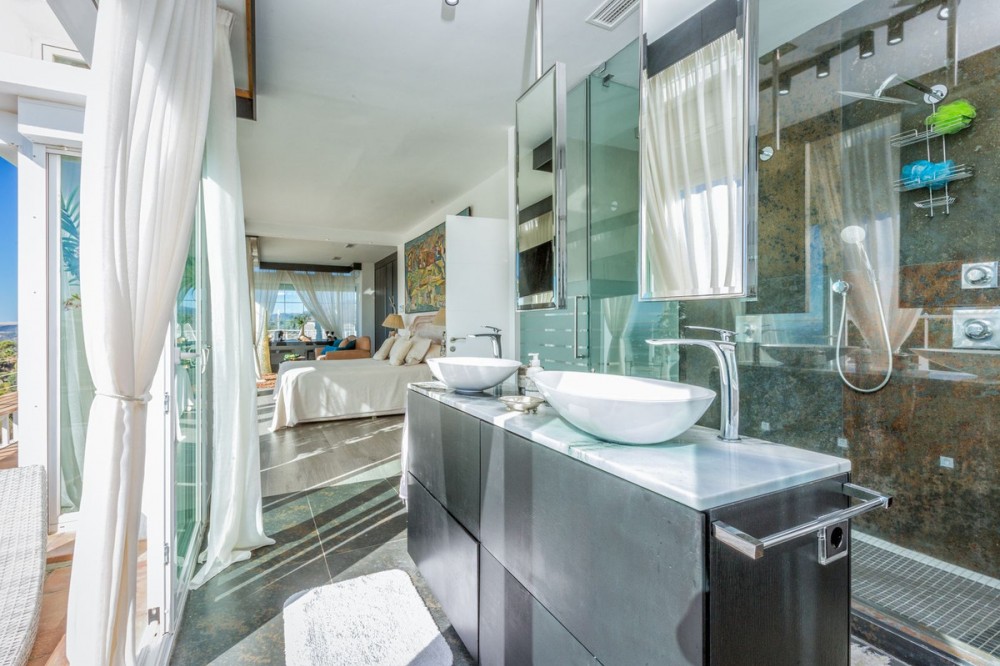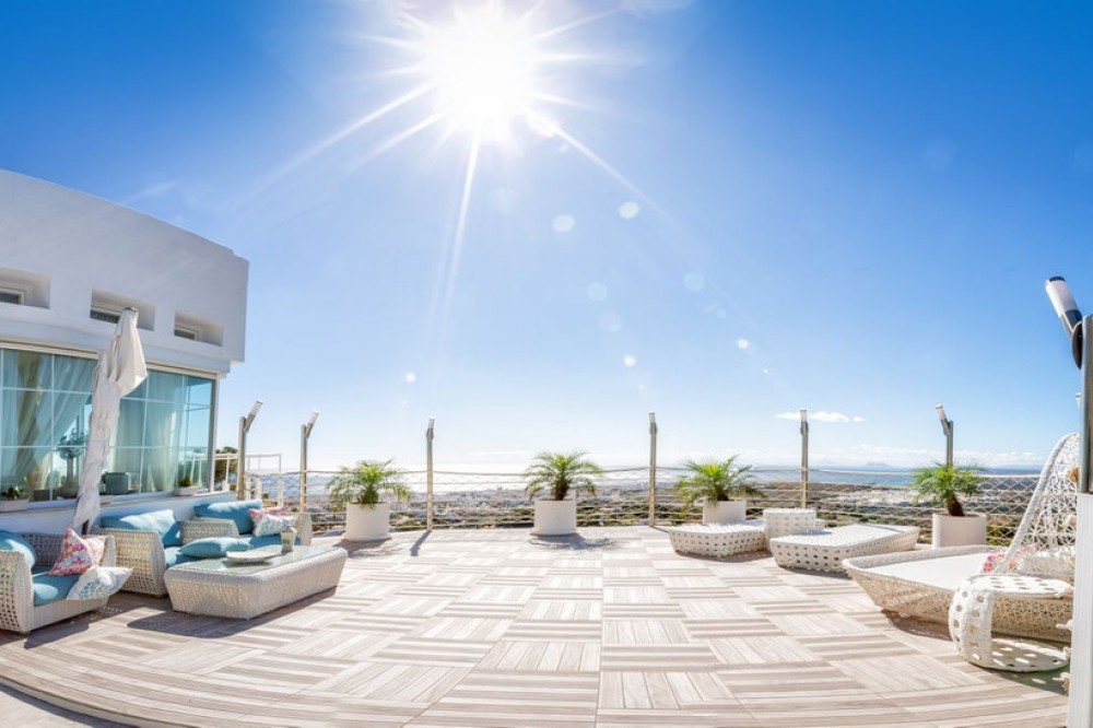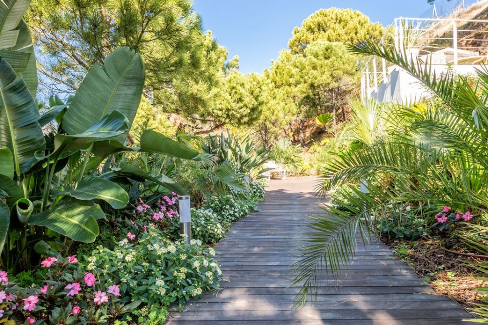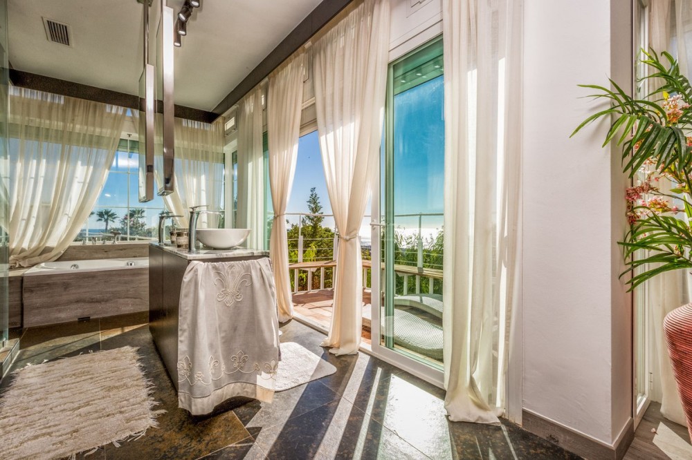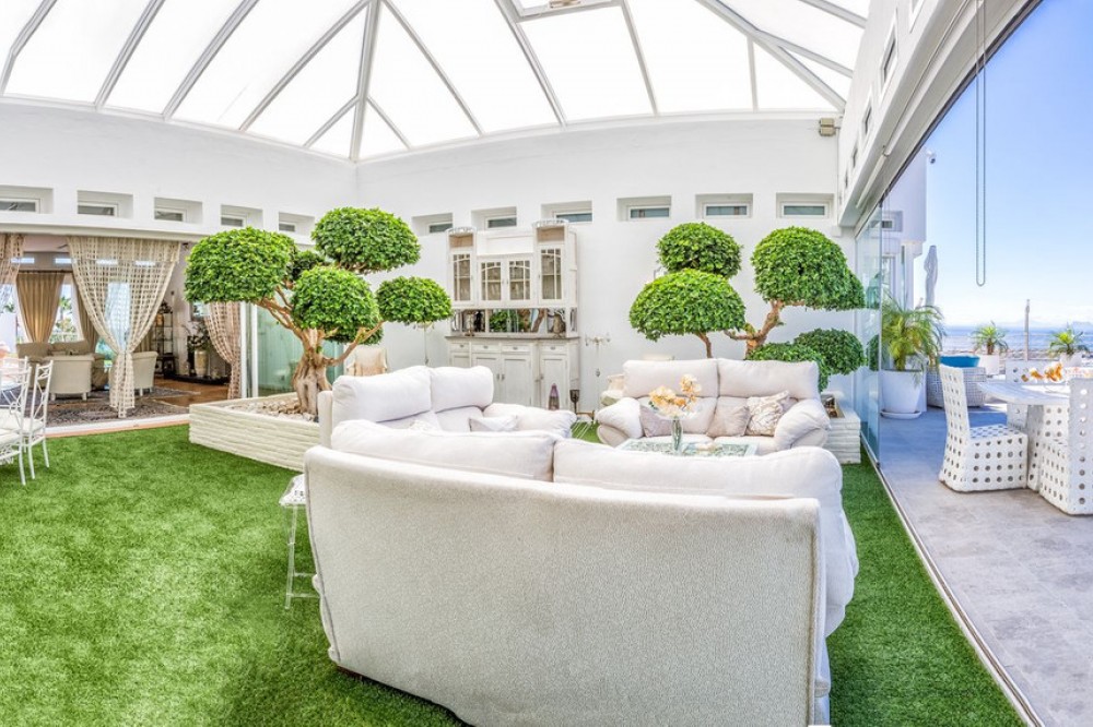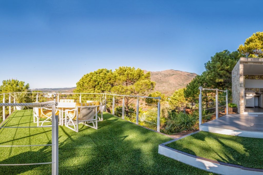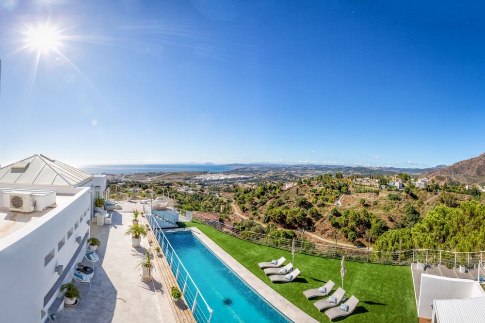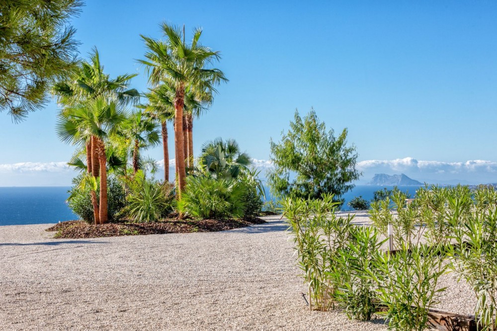- Magnificent contemporary-style villa, located just a 5-minute drive from the center of Estepona, in a privileged natural setting offering complete privacy and panoramic views of the sea, mountains, Gibraltar, and Africa. The property sits on a large plot of 15,500 m², of which 12,000 m² are completely flat, providing ample space for stables and a riding arena, tennis court, and other recreational or sports possibilities. The estate features around 30 olive trees, allowing for the production of your own olive oil, and a pine forest that enhances privacy and the natural charm of the surroundings. The property is situated at 200 m above sea level, offering 280º panoramic views. The villa’s design stands out for its elegant and modern architecture, with abundant natural light and carefully selected decor that reflects a refined and sophisticated style. Every detail has been considered to optimize comfort and efficiency, using high-quality materials and a sustainable approach, making it an eco-friendly and self-sufficient residence. In addition, this villa offers the best maintenance-cost-to-sale-price ratio on the entire Costa del Sol, with exceptionally low expenses for a property of this caliber: annual IBI of €3,087, approximate electricity consumption of €1,059 per year, and water expenses of €483 per year. These figures are remarkable considering the size of the estate, the built area, the extensive tropical gardens, and the presence of solar panels that enhance energy efficiency and sustainability. The home features six spacious en-suite bedrooms, each with a private bathroom, ensuring maximum comfort and independence, along with the possibility to create a seventh bedroom in the duplex area, adapting perfectly to the owner’s needs. This layout makes it an ideal home for large families or for hosting guests with complete privacy. The fully equipped open-concept kitchen flows seamlessly into the various indoor and outdoor living areas, designed to maximize functionality and light, accommodating different moods—from relaxing spaces to areas perfect for social gatherings. Additionally, it includes a party room and a separate guest area, expanding entertainment possibilities without compromising the privacy of the main residence. Water supply is guaranteed through both the municipal network and a private self-supply system, ensuring independence and comfort at all times. Outdoors, the gardens are meticulously designed and maintained, offering various relaxation areas and chill-out spaces to enjoy the Mediterranean climate and natural surroundings. The property also features a closed garage for multiple vehicles, a large parking area with capacity for over 30 cars, and a multipurpose area that can accommodate different configurations: tennis or padel courts, mini-golf, or even a helipad, combining practicality and exclusivity in one place. In short, this is an exceptional villa that combines luxury, privacy, sustainability, and an unbeatable location, designed for those seeking a high-quality lifestyle in one of the most sought-after areas of the Costa del Sol.