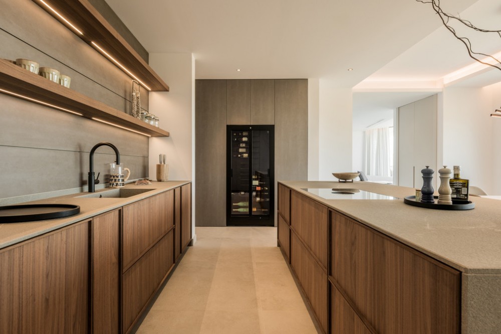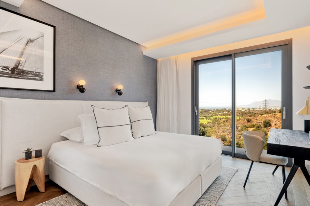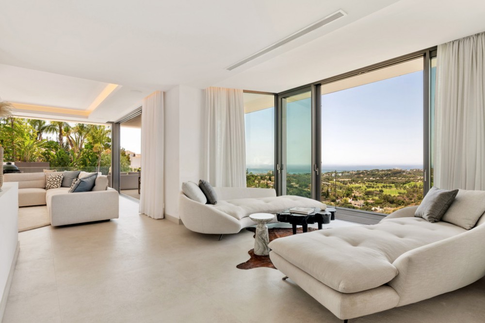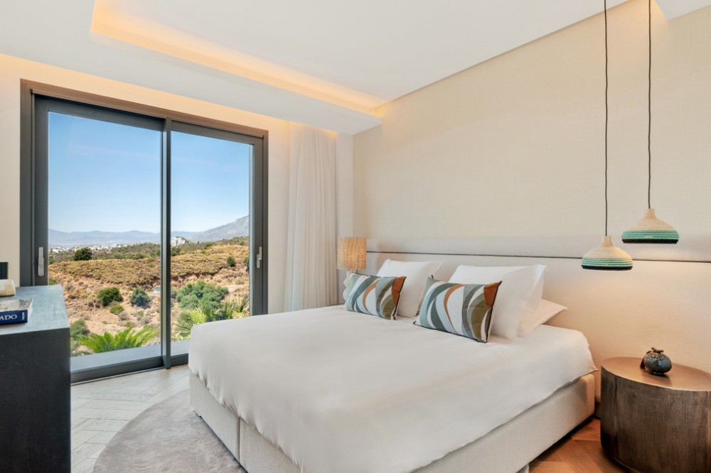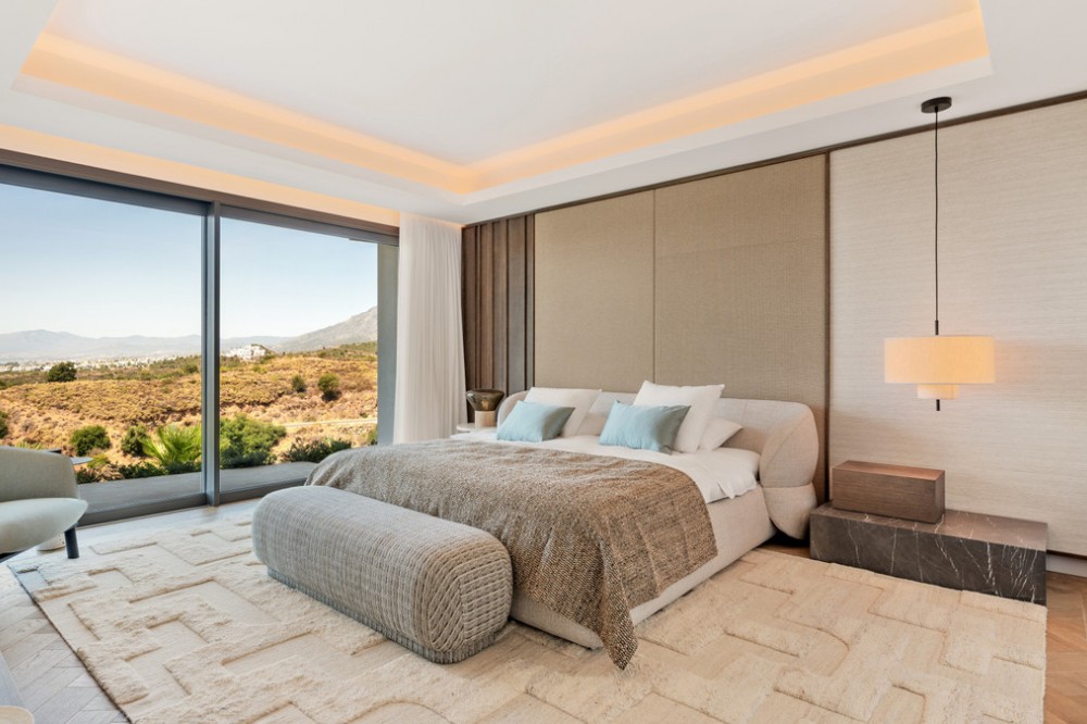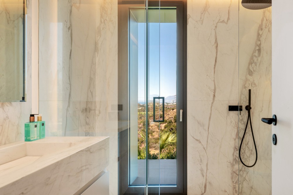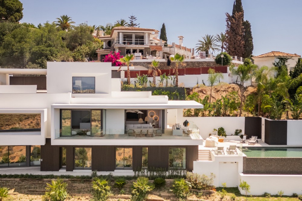 • Set on a south-facing plot of over 1,000 m², this newly built villa delivers sweeping views of the Mediterranean Sea and surrounding mountains. Developed by Sands Villas and designed by Gonzalez Jacobson, the property combines sharp modern architecture with natural textures and floor-to-ceiling glass for seamless indoor-outdoor living. The main level features an open-plan layout where the living, dining and kitchen areas flow to expansive terraces through full-width sliding doors. A private infinity pool, covered dining lounge and landscaped gardens create a true extension of the interior spaces. A private driveway with covered carport provides convenient access and secure parking. Inside, the villa is finished to a high standard with elegant stone surfaces, warm wood cabinetry and discreet lighting. Generous bedrooms include stunning ensuite bathrooms, while the master suite offers direct terrace access and panoramic sea views. With its modern design, private setting and exceptional vistas, El Rosario 430 is a standout contemporary home in Marbella East.