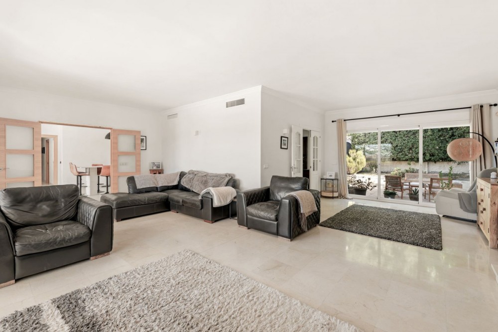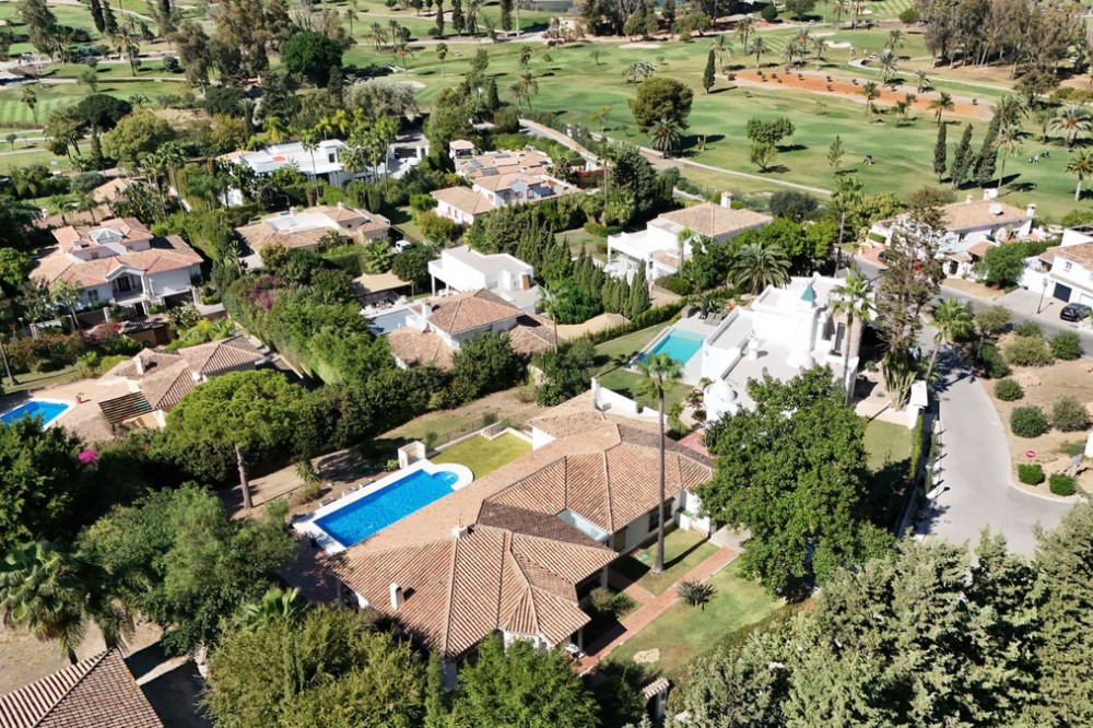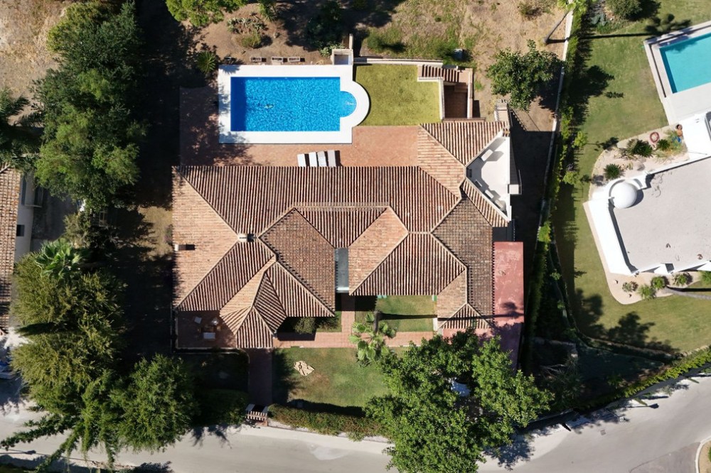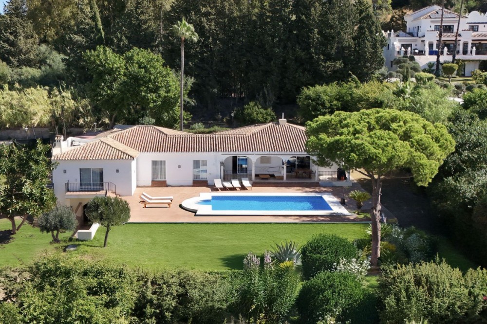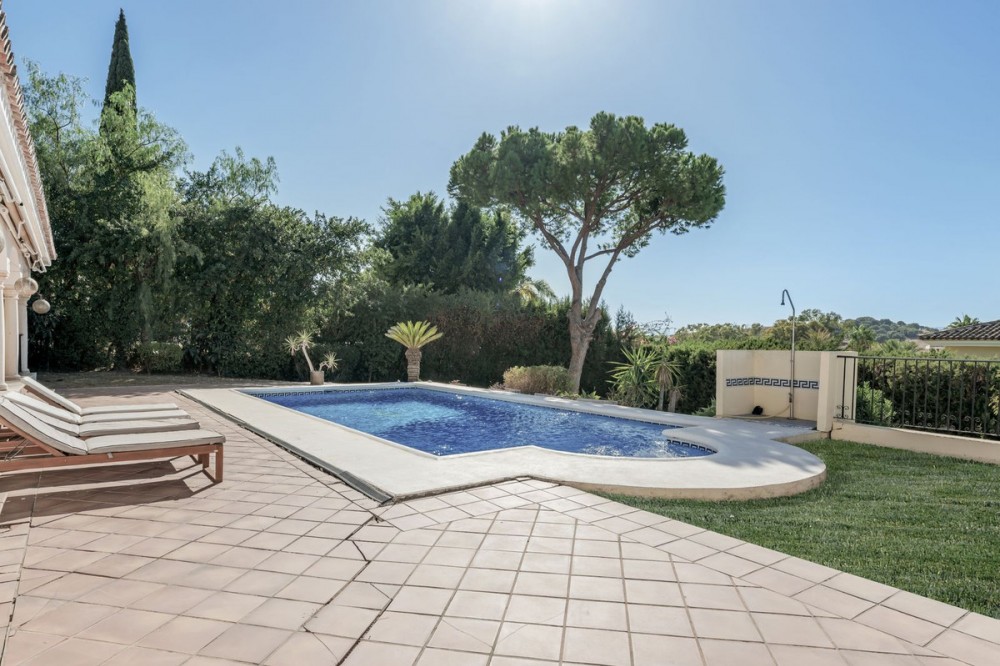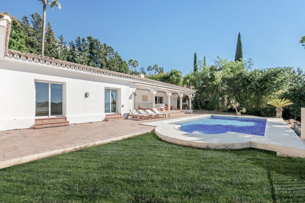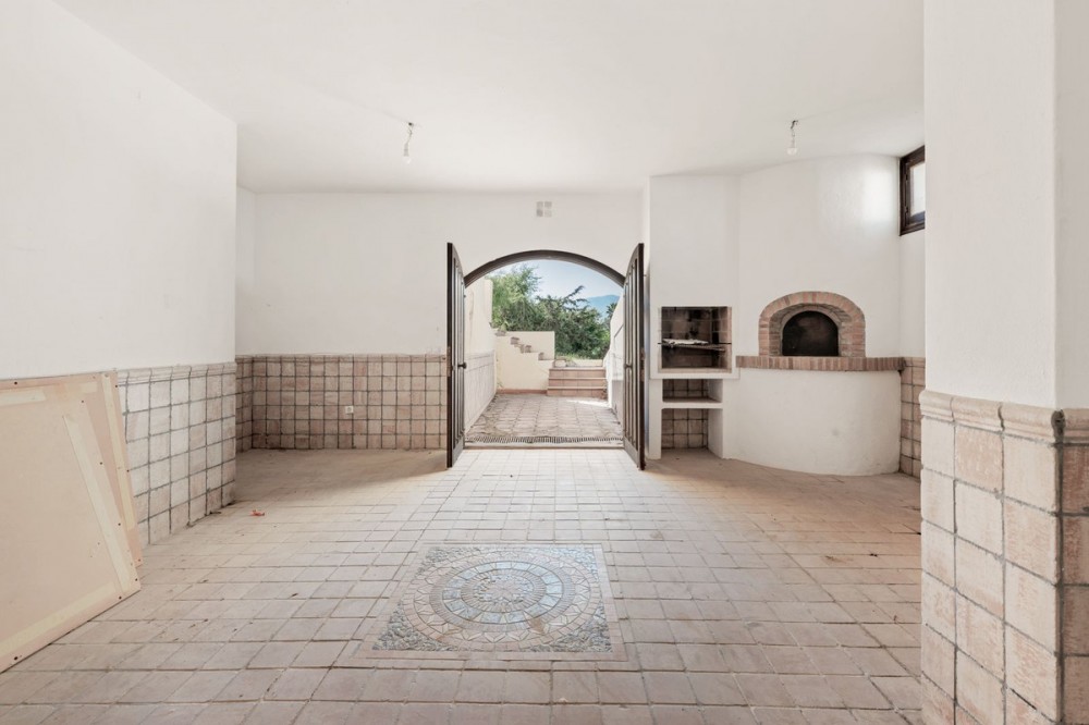 - Situated in the sought-after residential area of Paraiso Medio and just around the corner from the Paraiso Golf Club, this beautiful Andalusian-style villa is a fantastic opportunity! The villa is largely built over a single floor and well distributed for maximum comfort. The property offers a pedestrian entrance as well as separate car access to a covered parking area and garage beyond. Through the front door we have a welcoming entrance hall with cloakroom and WC. On the left hand side of the entrance hall we have the living room fireplace and with access to both the front and back terraces. On the right hand side we have the new kitchen and dining room with a covered utility patio off as well as access to the covered terrace and pool area. By way of sliding doors, the living room and kitchen area are also connected and on the right of the dining area we have the bedroom wing. There are two identical and well appointed guest bedrooms facing the garden and on the opposite side of the corridor is the corresponding guest bathroom. Then we have a spacious guest bedroom facing the front garden and the en-suite bathroom has also been fully renovated. Finally the master bedroom at the end with access to the back garden and a luxurious & spacious fully renovated en-suite bathroom. From the back terrace and garden we have beautiful open views to the surrounding landscape, mountains and golf course. There is also a staircase access to a lower level with a room for a bodega, bar or gym perhaps. This Andalusian villa is very well located and offers tons of potential. Two bathrooms and the kitchen have already been renovated but some work is still recommended, specifically around the terrace area. In our photos you can find an example of what the renovated terrace would look like, using a retention wall to maximise the depth of the spacious plot. In this area the max built percentage is 30% and the max footprint is 25% so it is possible to extend the current existing structure.