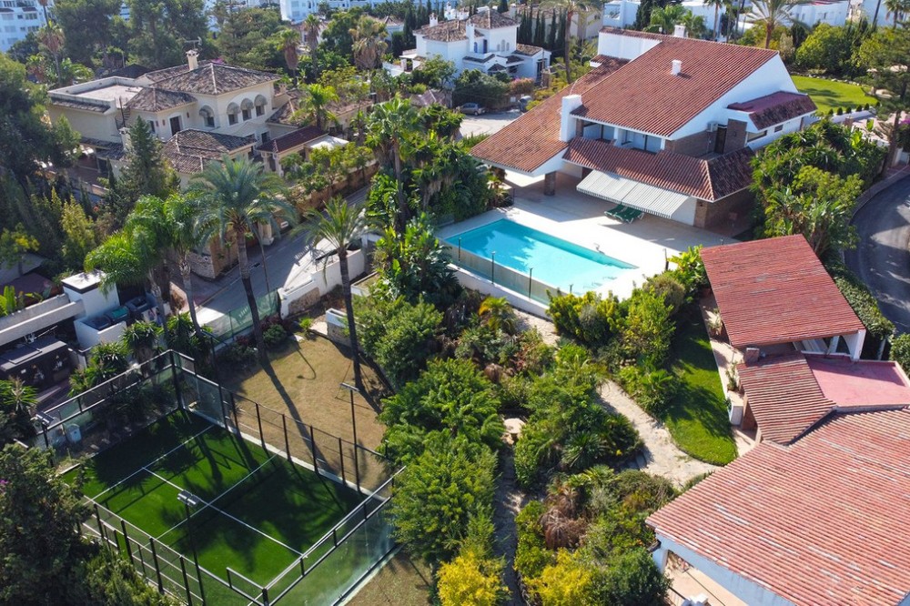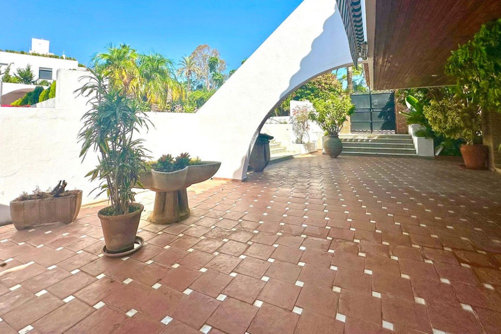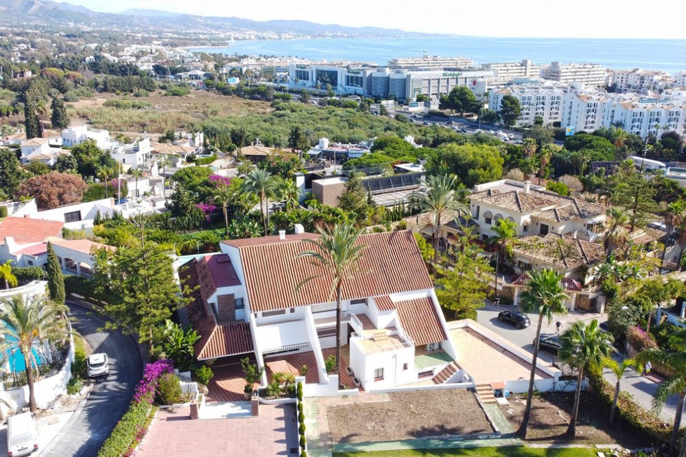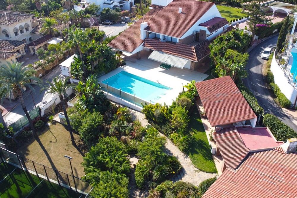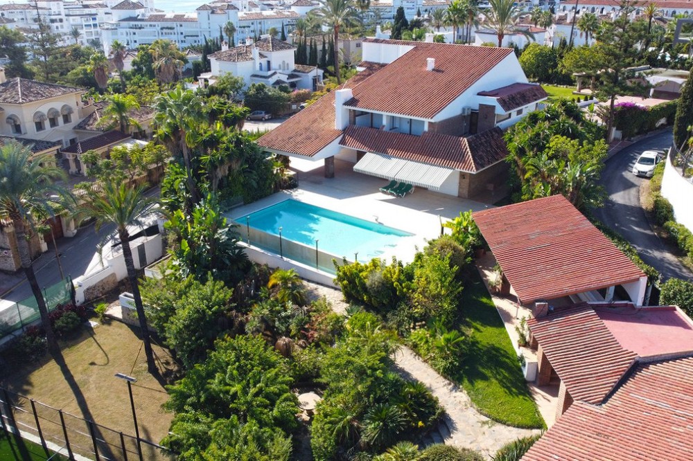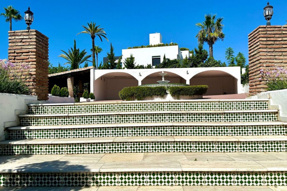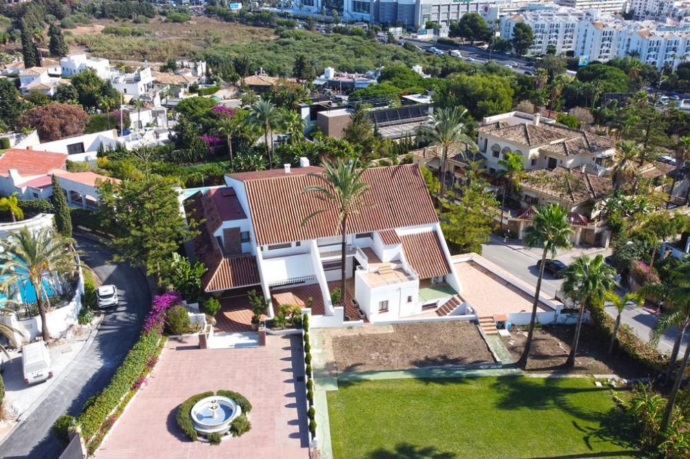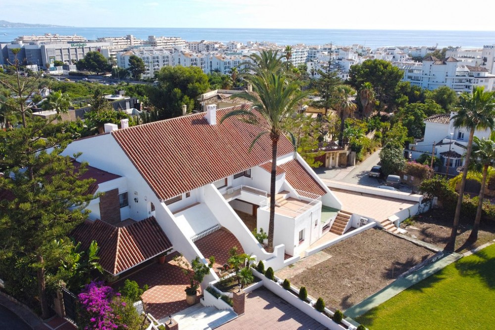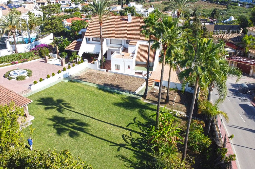 • Attentie investeerders/ontwikkelaars. Exclusief object op een bevoorrechte locatie, uniek op de markt, op slechts 200 meter van Puerto Banús. Ruime villa in goede staat, met een totale bebouwde oppervlakte van 834 m² plus 573 m² aan terrassen en veranda's op een perceel van 4.348 m². Gebouwd in 1981. Gelegen op het oosten. Het hoofdgebouw bestaat uit een ruime entreehal, gastentoilet, grote woonkamer met dubbele plafondhoogte, aparte eetkamer, keuken, zitkamer met toegang tot het terras, een slaapkamer met en-suite badkamer en aparte ingang, en een service-ingang. De bovenverdieping omvat een zitkamer, een tweede slaapkamer met toegang tot een balkon en en-suite badkamer, een derde slaapkamer met en-suite badkamer, een vierde slaapkamer met toegang tot een terras met prachtig uitzicht op La Concha en de zee, en een grote master suite bestaande uit een slaapkamer, kleedkamer, grote badkamer en terras met uitzicht. Ruime parkeerplaats en garage voor 5 auto's. De overige gebouwen bestaan uit een garage voor één auto, een slaapkamer met badkamer voor de chauffeur, een slaapkamer met badkamer voor het personeel en een wasruimte. Grote barbecueplaats met een ruim overdekt terras. Infinity pool. Paddle tennisbaan. Prachtige tuin met veel bomen. Het perceel is geclassificeerd als verdicht stedelijk gebied (SUC) en heeft de bestemming UE-4 Vrijstaande eengezinswoning, met een minimale perceelgrootte van 1.000 m² en een bebouwbaar oppervlak van 30%. Vanwege de hoge vastgoedprijzen in de omgeving zal dit perceel naar verwachting aanzienlijke winst opleveren voor investeerders/ontwikkelaars die tot vier villa's willen bouwen.