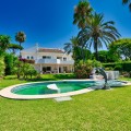 - This remarkable beachfront villa, located adjacent to the renowned Nikki Beach in Elviria, East Marbella, offers an unparalleled living experience. Spread across two levels, the villa features four spacious bedrooms, each with its own en-suite bathroom, a guest toilet, an office space, and an expansive, sunlit living room seamlessly connected to a separate dining area. A covered terrace grants access to the sprawling, beautifully landscaped garden, complete with a private heated pool – the perfect setting for enjoying the coastal climate. The property boasts a private driveway and two separate garages, ensuring ample parking and convenience. This exclusive residence is situated within the prestigious Los Jardines de Las Golondrinas gated complex, providing round-the-clock security for your peace of mind. It stands in close proximity to the esteemed Hotel Don Carlos and the Don Carlos Tennis Club, further enhancing the luxurious lifestyle that this location affords. Incorporating both natural beauty and refined living spaces, this beachfront villa represents the epitome of seaside sophistication and comfort. Experience the best of Marbella's East End with this extraordinary property.