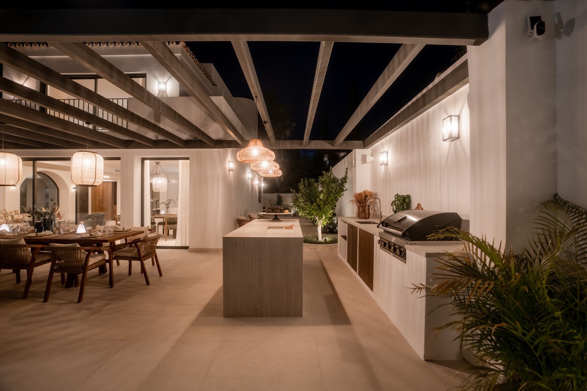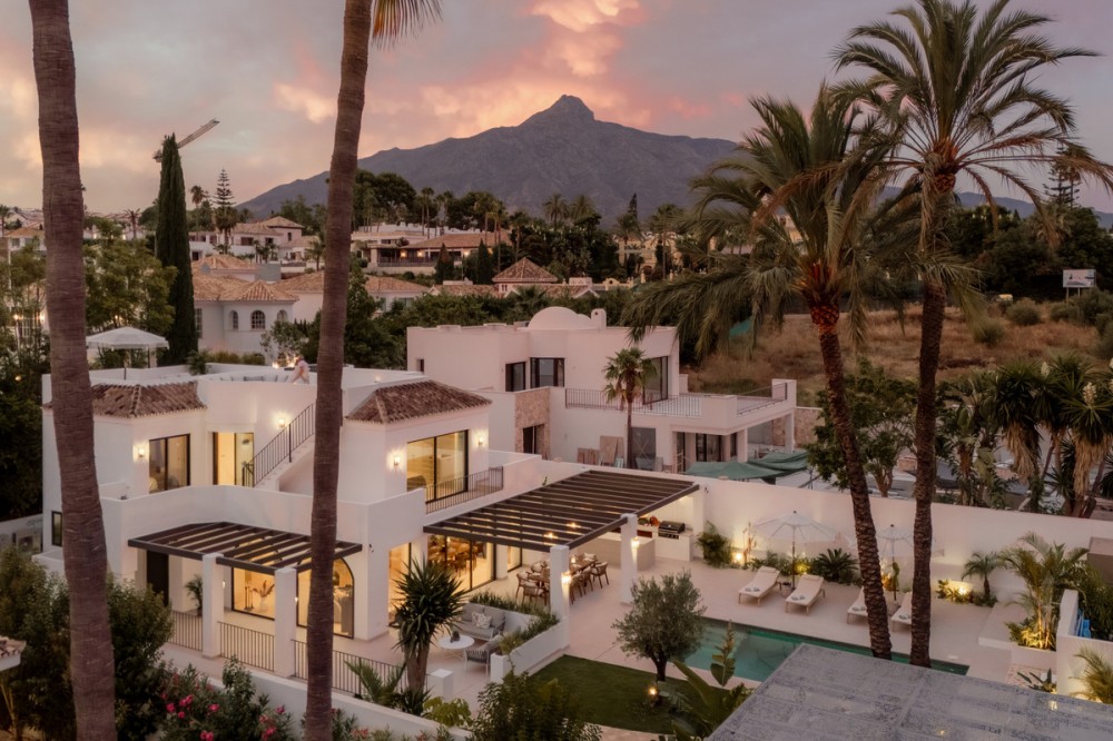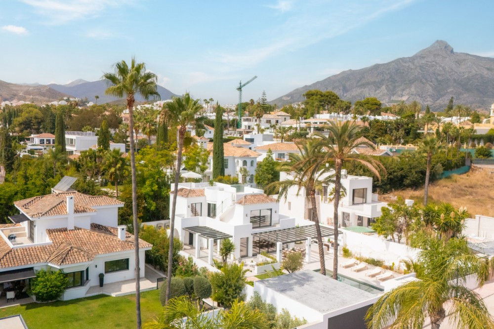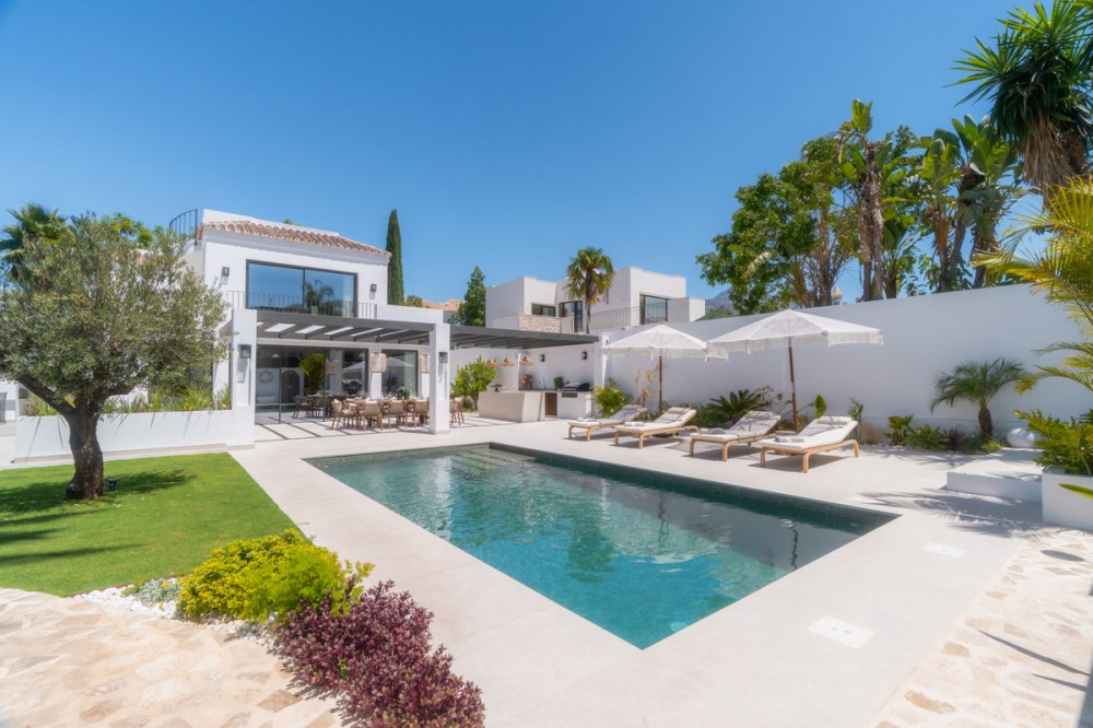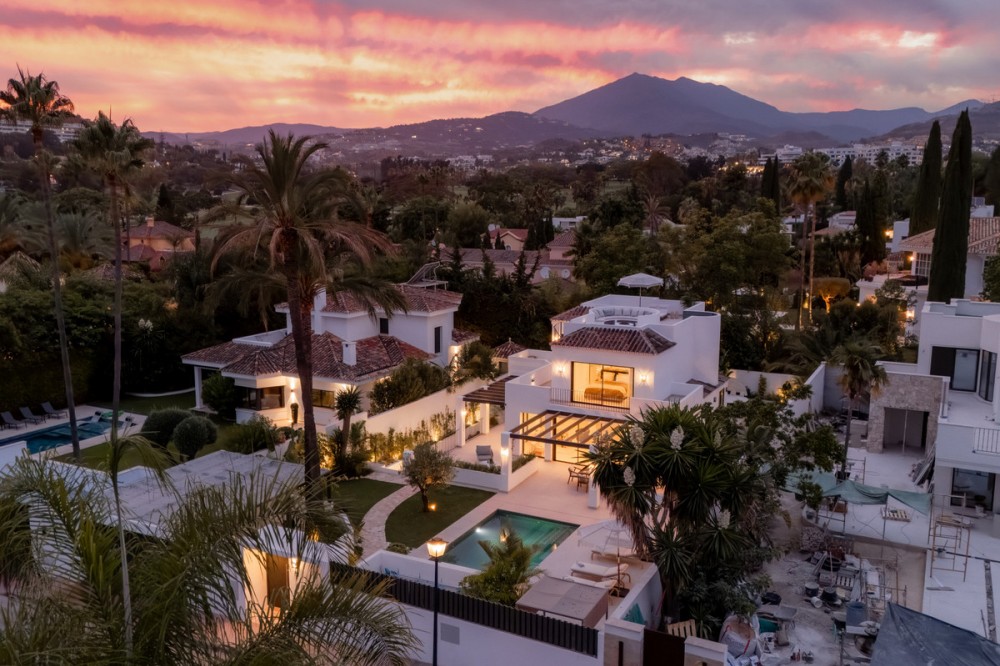 • Deze moderne, luxe villa met zes slaapkamers staat te koop in de Golfvallei van Marbella. De woning biedt 600 m² woonruimte op een perceel van 820 m² met 125 m² aan terrassen. De villa ligt op slechts enkele minuten van Aloha Golf Los Naranjos en Las Brisas Golf Club en biedt snelle toegang tot winkels, restaurants en Puerto Banús, waardoor het ideaal is voor kopers die privacy en gemak waarderen. De villa beschikt over zes slaapkamers met eigen badkamer en een Zweedse keuken met Miele-apparatuur. Verder is er vloerverwarming met Daikin airconditioning en Airzone, plus een privéspa met een Finse sauna, een hamam en een groot bad. Een bioscoopkamer zorgt voor extra comfort en twee gastentoiletten en twee eigen parkeerplaatsen maken het geheel compleet. De buitenruimte is ontworpen voor luxe wonen. Het terras bij het zwembad geniet de hele dag van de zon en is verbonden met een Sonos-geluidssysteem met volledige wifi-dekking. Een dakterras biedt uitzicht op de bergen en de vallei van zonsopgang tot zonsondergang, waardoor deze woning een uitstekende keuze is voor kopers die op zoek zijn naar een moderne, instapklare villa in Marbella.