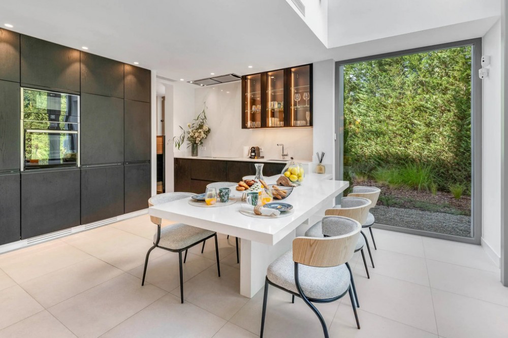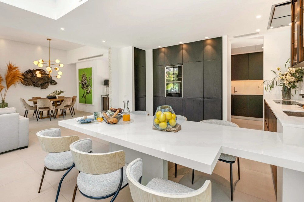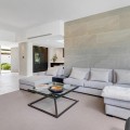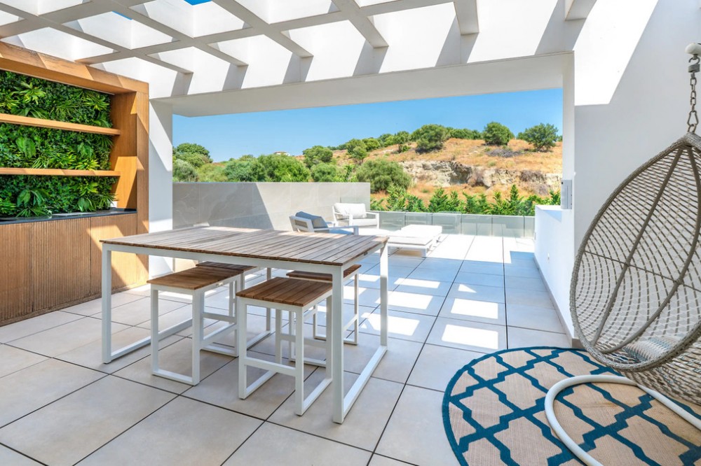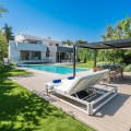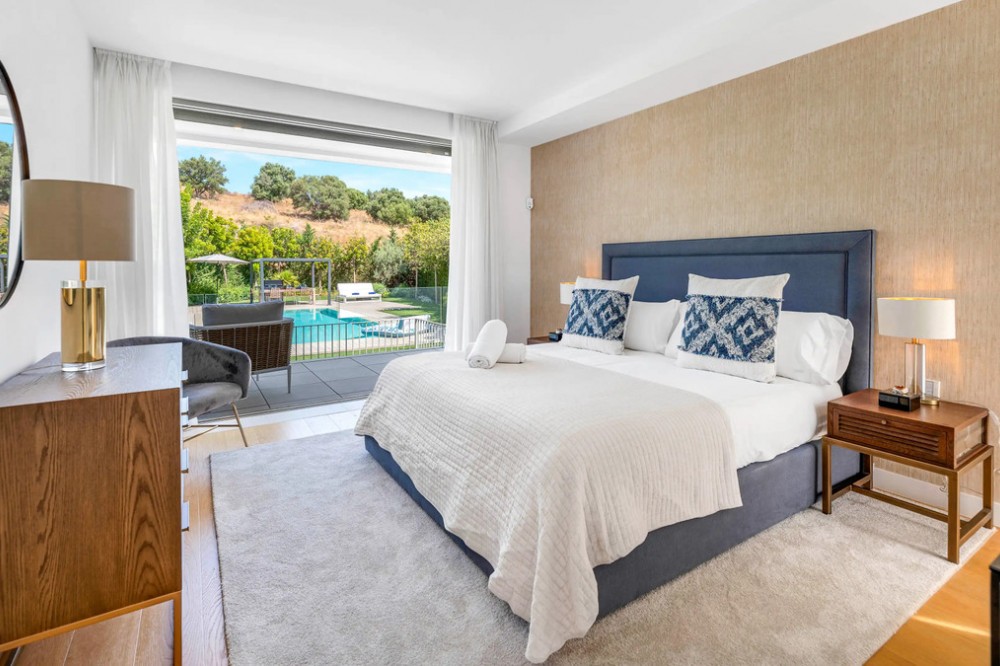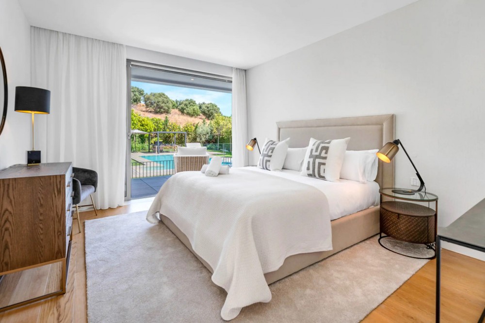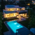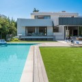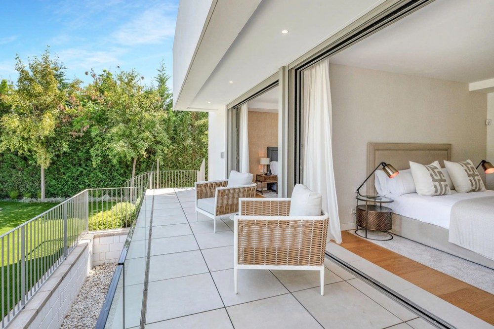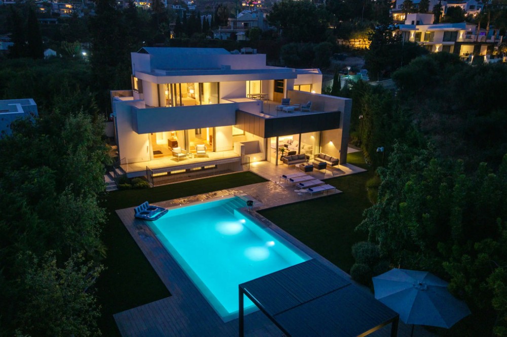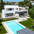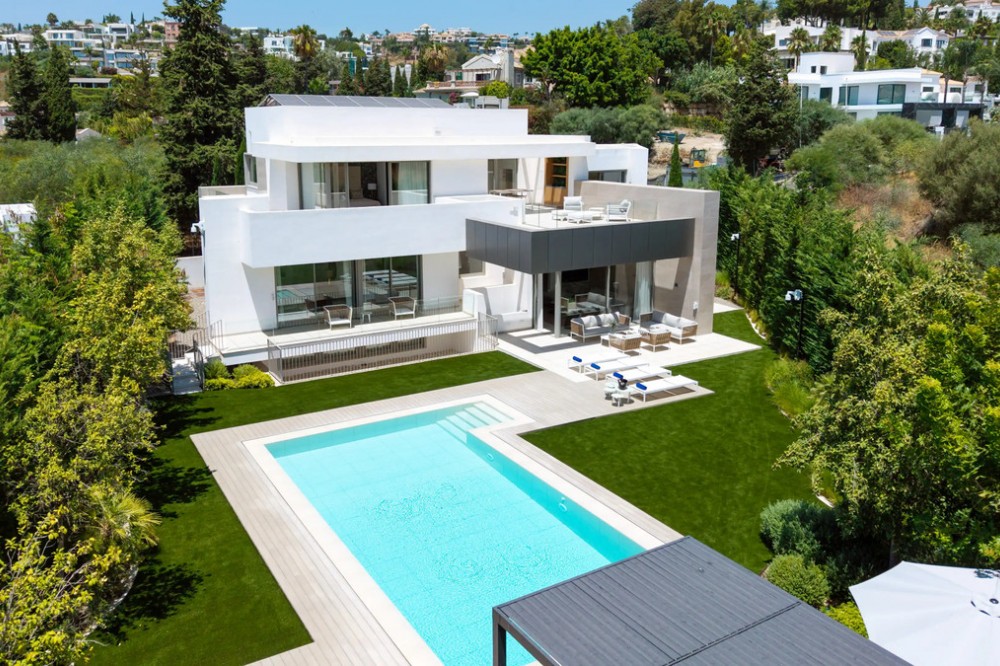 - Presenting this modern five bedroom villa on the New Golden Mile, set minutes from the coast and close to Puerto Banús and Marbella. The home has a southeast orientation for natural light and open views, and it offers full privacy. The layout is spacious and includes an open plan kitchen, living and dining area that leads to wide terraces and the garden. The upper level holds the calm bedroom suites, each with a king bed and direct terrace access. Outside, you find a private pool, manicured lawns and a shaded dining area with a BBQ. The lower level has a cinema room, a second lounge, a bar area, a workspace and a small wellness zone for yoga or light training. The villa includes a full alarm system, air conditioning and a safety box and is designed for buyers who want comfort, privacy and a clean modern style in a prime Marbella location. It is ideal for families, golfers and anyone seeking a luxury home.