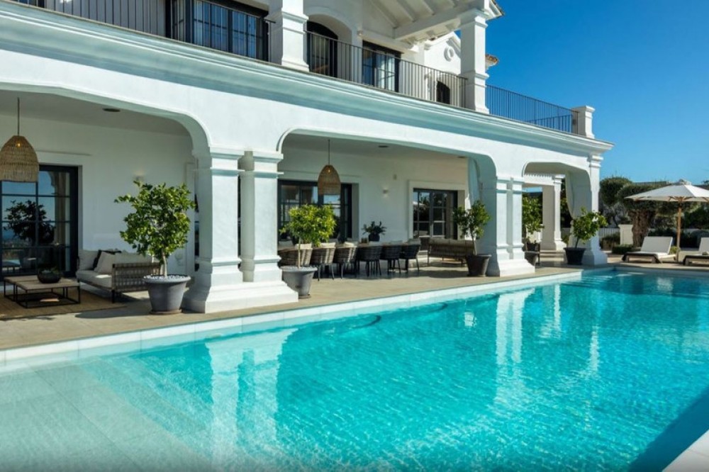 - Set within the prestigious, 24-hour secure enclave of the Marbella Club Golf Resort, this Andalusian-inspired yet contemporary mansion offers an extraordinary fusion of timeless elegance and modern luxury. The exclusive resort is home to an exceptional 18-hole golf course designed by the legendary Dave Thomas, alongside renowned equestrian facilities that host the Spanish Show Jumping Championships. Upon entering, you are greeted by an expansive lounge featuring a sleek glass fireplace that frames stunning views of the 113 m² pool, manicured gardens, and the Mediterranean Sea. The pool area has been enhanced with premium features, including a heated system, electric cover, and solar panels dedicated to water heating, ensuring year-round enjoyment with exceptional energy efficiency. Adjacent to the main living space, a private TV room and a sophisticated formal dining area provide ideal settings for both relaxation and entertaining. The ground floor also includes two spacious en-suite bedrooms, each with direct access to the landscaped gardens adorned with exquisite stonework, creating a serene atmosphere. The open-plan modern kitchen, equipped with high-end Gaggenau appliances, combines sleek Scandinavian design with superior functionality, making it perfect for daily use or hosting guests. Upstairs, the master suite impresses with a bespoke dressing room and a luxurious marble bathroom, featuring a sculptural bathtub with panoramic views of the sea and Gibraltar. Two additional bedrooms and a fully appointed bathroom complete this level, ensuring comfort and privacy throughout. Leisure and wellness features include a private gym, sauna, steam room, and a dedicated cinema room fitted with Bang & Olufsen technology. Outdoors, generous terraces and a built-in kitchen with barbecue offer breathtaking views of the sea, Gibraltar, and North Africa, with a south-facing orientation ensuring sun from sunrise to sunset. Security and convenience are paramount, with perimeter alarms, surveillance cameras, and parking for up to ten vehicles, including a closed garage and covered carports. Residents also enjoy access to the resort’s clubhouse, acclaimed for its elevated Mediterranean cuisine and tranquil lake views. With six bedrooms, six bathrooms, premium finishes, advanced technology, and thoughtfully designed leisure spaces, this mansion offers an exceptional lifestyle of privacy, style, and sophistication in one of the Costa del Sol’s most sought-after locations.