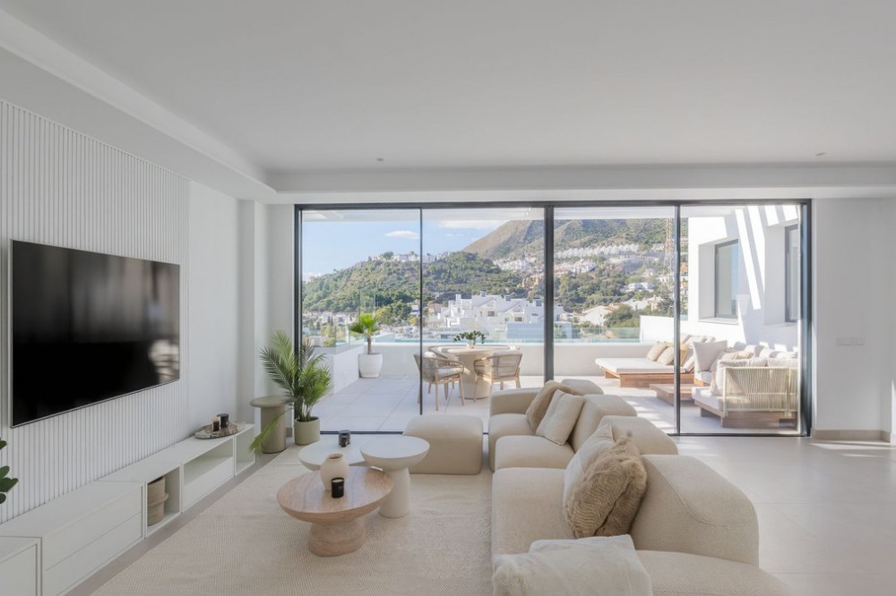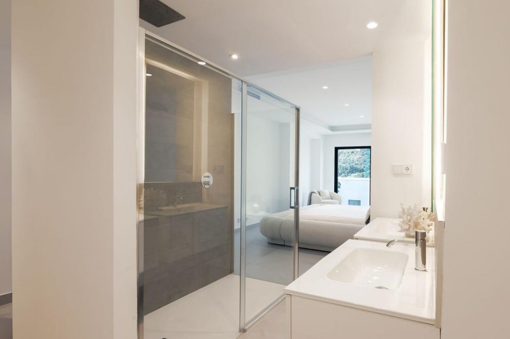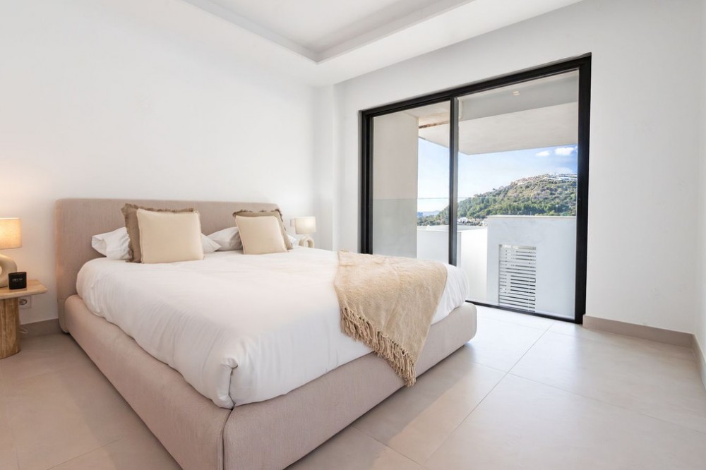 - Discover this spectacular contemporary villa with panoramic views of the Mediterranean Sea, Fuengirola Bay and the mountains. Located in one of the most sought-after areas of Benalmádena, it offers a unique lifestyle where elegance, privacy and comfort come together perfectly. Modern design and perfect layout. The property has 4 spacious en-suite bedrooms and a guest toilet. From the entrance, floor-to-ceiling windows fill each space with natural light and highlight truly unforgettable views. The main space combines a designer kitchen, dining room and living room in an open-plan concept that flows onto a west facing terrace. Here you can enjoy outdoor living on a spectacular, large terrace with a private swimming pool. Premium fittings and smart technology. As a resident of Marae, you will enjoy a communal swimming pool, gym and leisure area, as well as an unbeatable location: Just minutes from the beach, the marina and renowned restaurants such as Yucas and Trocadero. Close to Benalmádena Pueblo and international schools. Excellent access to the airport, golf courses and main transport links. Marae Residence is a development designed to impress and conceived to enjoy Mediterranean luxury to the fullest. Perfect as a family home, second home or secure investment on the Costa del Sol.