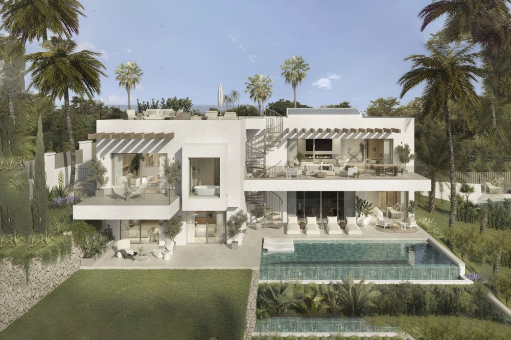 - Moderne villa aan de golfbaan met uitzicht op zee | El Paraíso, Benahavís | Oplevering juni 2026 Deze moderne, nieuwbouwvilla, direct gelegen aan de golfbaan in El Paraíso, is momenteel in aanbouw en de oplevering is gepland voor juni 2026. De woning ligt boven de fairways en is omgeven door volwassen pijnbomen. Het biedt een prachtig uitzicht op de golfbaan en de zee, veel privacy en een gemakkelijke toegang tot Marbella en Estepona. De villa is verdeeld over vier verdiepingen en combineert strakke architectonische lijnen met een sterke verbinding tussen binnen en buiten. De kamerhoge ramen en ruime terrassen creëren lichte, open leefruimtes, terwijl een neutraal kleurenpalet het gevoel van ruimte en licht versterkt. De woning heeft een bebouwde oppervlakte van circa 404 m² en een totale bruikbare oppervlakte van meer dan 600 m², inclusief terrassen en solarium. Op tuinniveau bevinden zich drie gastenslaapkamers met eigen badkamers, die allemaal directe toegang bieden tot de aangelegde tuinen en het overloopzwembad. Overdekte terrassen bieden het hele jaar door ruimte om buiten te vertoeven. Op de begane grond bevindt zich de master suite met een inloopkast, een eigen badkamer en een privéterras, naast een extra gastenslaapkamer en een hal. De woonverdieping is ontworpen om gasten te ontvangen, met een open woon-, eet- en keukenruimte die uitkomt op een ruim terras met panoramisch uitzicht op de golfbaan. Het solarium op het dak biedt extra buitenruimte met vrij uitzicht en zon gedurende de hele dag. De villa is afgewerkt met moderne systemen, energiezuinige oplossingen en hoogwaardige materialen, en biedt een praktische en evenwichtige indeling. Gelegen in El Paraíso, bevindt de woning zich dicht bij golfbanen, scholen, stranden en andere voorzieningen en biedt een sterke combinatie van locatie, ontwerp en waarde op lange termijn.