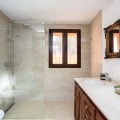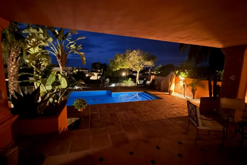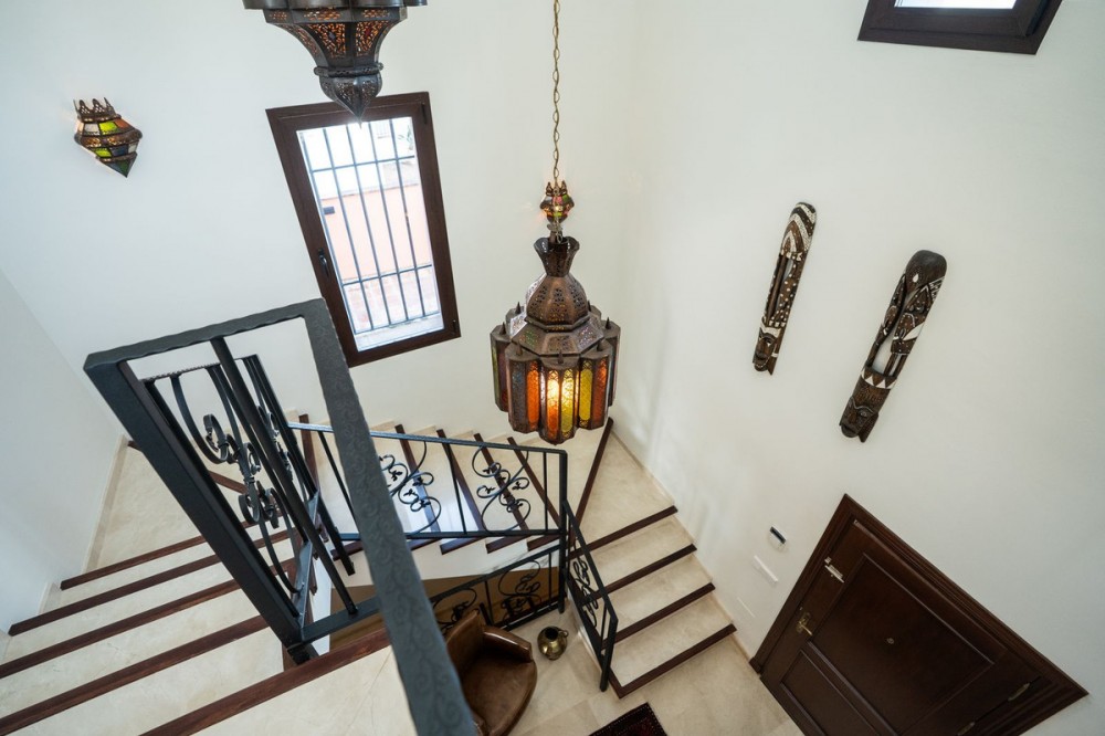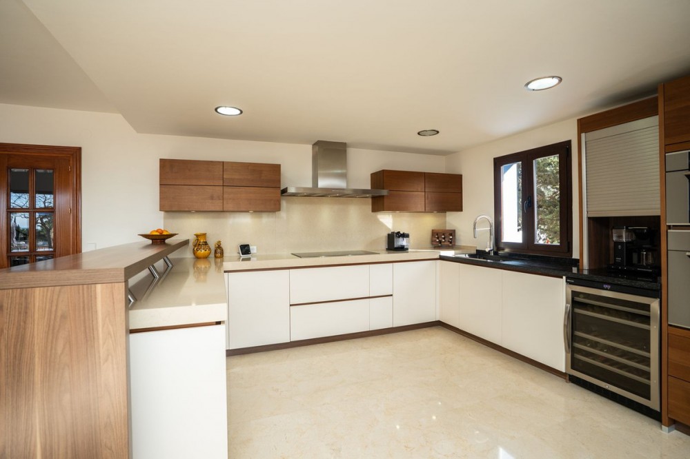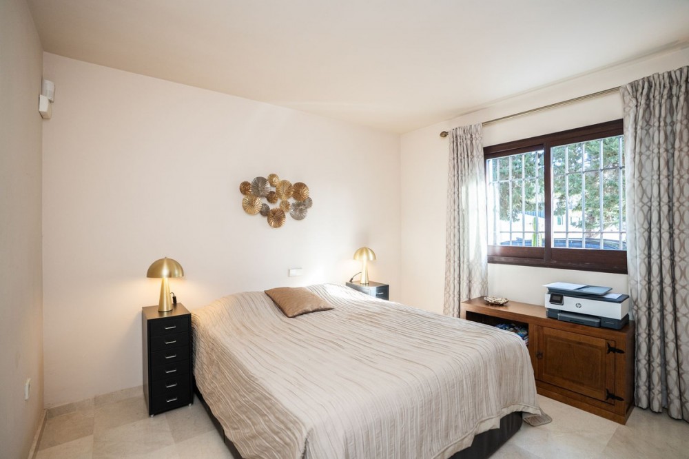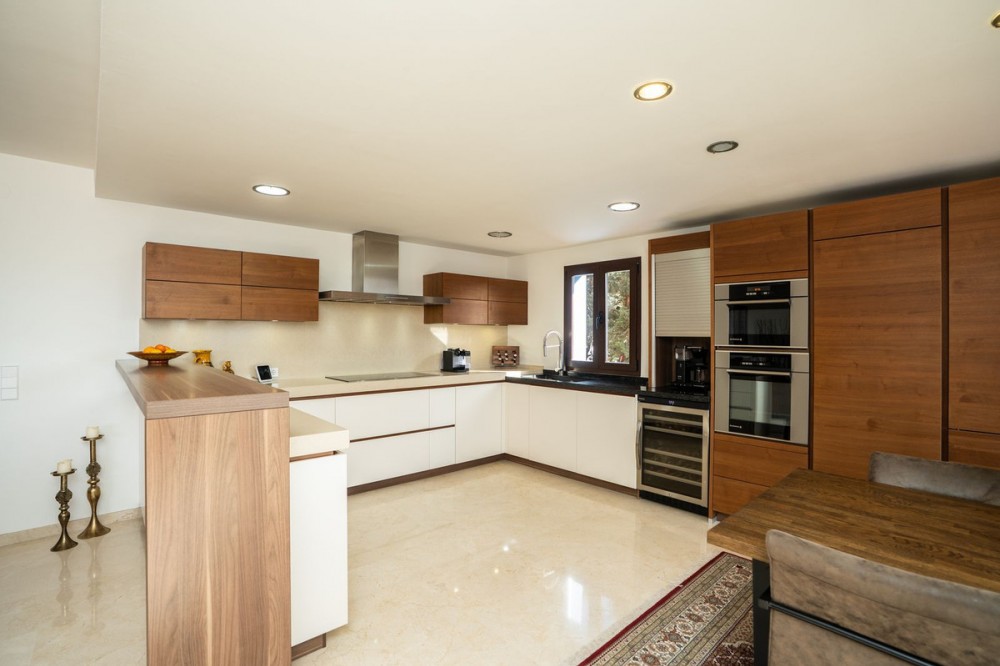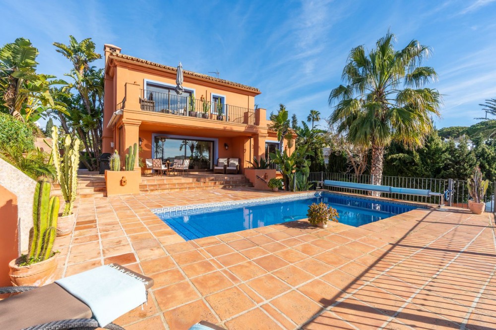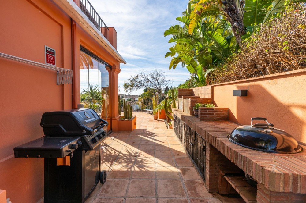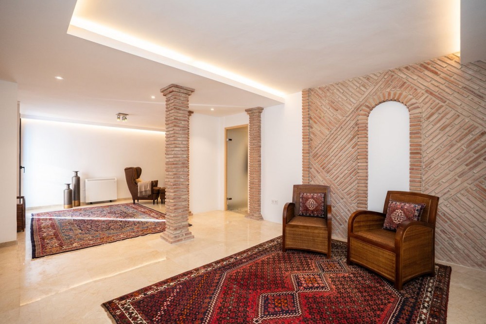- This wonderful villa on 3 levels, built in a timeless traditional style with the highest construction qualities, is located in one of the most exclusive and peaceful streets of prestigious Marbesa/Marbella, just a short walk from the beach and just a short walk from 5 beach restaurants, 2 super markets @ the 5 star hotel Don Carlos. Set on a generous plot, it offers maximum privacy, security and comfort. Upon entering the property, you are welcomed by a spacious hallway that leads into the impressive and bright living room with fire place, where high ceilings enhance the feeling of space and elegance. The living features a state of the art Italian kitchen and leads onto the large terrace with access to the private heated pool with sea views. Partially covered terrace BBQ area for lovely summer evenings. The kitchen is fully equipped and very practical. The villa combines timeless style with modern comforts such as underfloor heating in all 3 bathrooms, high-quality double walls with insulation. All 3 bathrooms have walk in showers. On the lower level you will find a Spanish bodega, storage room, laundry room, Finnish sauna, open plan tv/games room. large guest bedroom with ensuite bathroom with direct access to the lower terrace Other highlights include several covered terraces perfect for outdoor dining, three parking spaces, 24-hour security within the urbanisation, and advanced alarm systems. A unique property in Marbesa, perfect for those seeking a luxury home within walking distance of the beach, with absolute privacy, yet only minutes from golf courses, restaurants, international schools and Marbella town It also enjoys close proximity to exclusive amenities, fine dining, and international schools. Additionally, it is just eight minutes from the iconic Puerto Banús, 15 minutes from Marbella’s vibrant center, and a 40-minute drive from Málaga International Airport