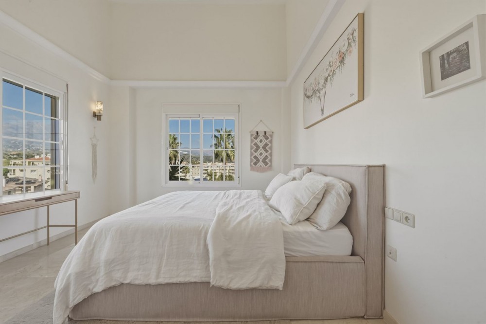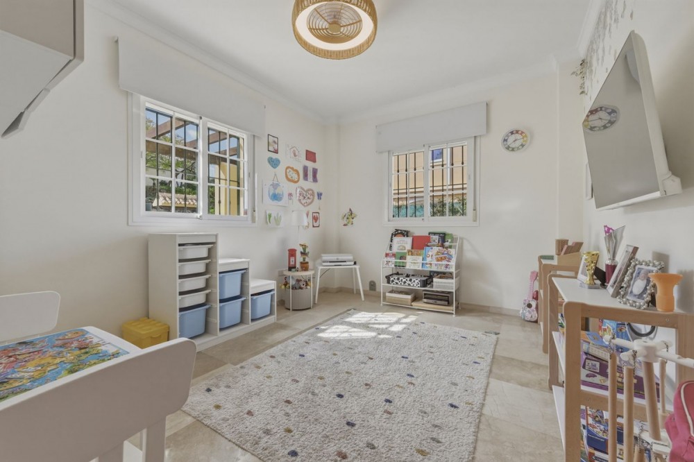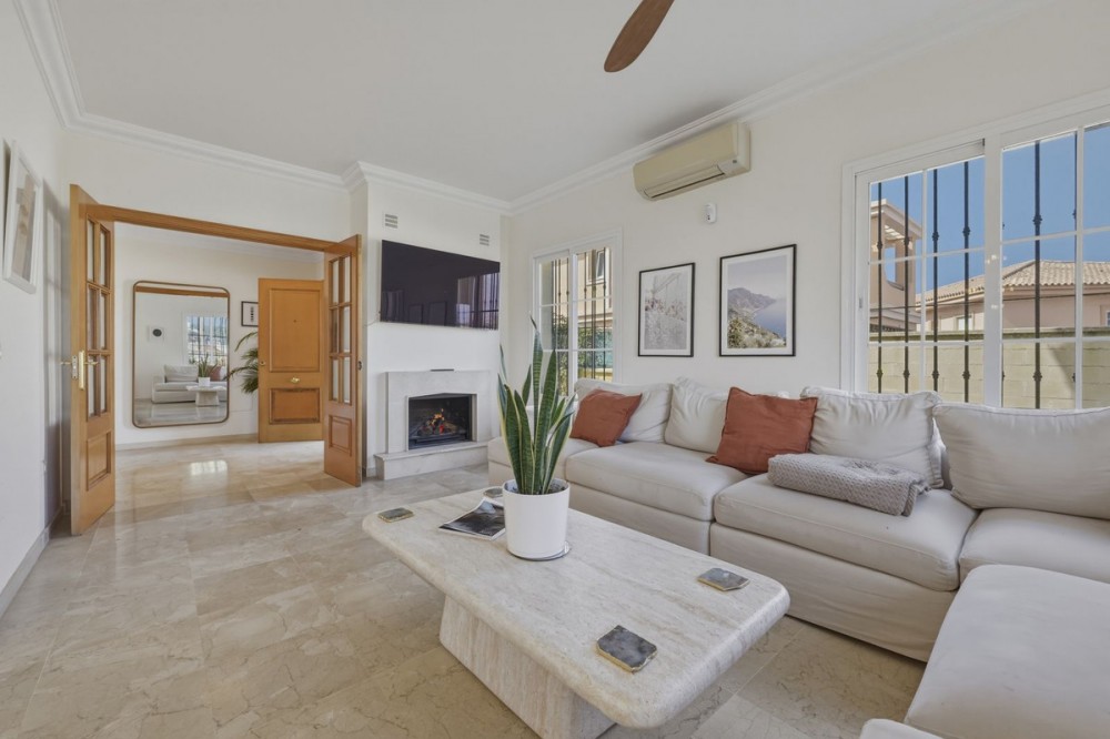 - Detached villa on a quiet residential street in La Cala Hills, Mijas, offering spacious accommodation, flexible living, and strong appeal for both families and investors. The property is arranged over two well-proportioned levels and is suitable for permanent living, relocation, or long-term rental. The upper floor comprises four spacious bedrooms and two bathrooms, including a generously sized master bedroom positioned on the corner of the house. The master benefits from two separate windows and open views towards the Mijas mountains, providing excellent natural light. One additional bedroom enjoys access to a private balcony. All bedrooms are well sized and suitable for comfortable long-term use. The ground floor offers a bright open-plan living and dining area with a working fireplace, an independent fitted kitchen, a full bathroom with bath, and a fifth spacious room currently used as a playroom. This room offers genuine flexibility and can easily function as a guest bedroom, home office, or additional living space, making the layout attractive for both family living and rental use. Access to the outdoor areas is via the living room and from either end of the house through a good-sized entrance hall, allowing easy circulation between indoor and outdoor spaces. Outdoor living is a key feature of the property. The garden includes covered and open terraces, a private swimming pool, and space for dining and relaxation throughout the year. Parking is available directly in front of the house, within the garden via an electric gate, and nearby on an adjacent road for visitors. The villa features marble flooring throughout, air-conditioning units providing heating and cooling, a private electric vehicle charging point, and is located in a peaceful residential setting with no community fees. Furniture may be partially included by negotiation, offering flexibility for buyers planning immediate occupation or rental. Conveniently located within walking distance of international schools, nurseries, sports facilities, cafés, and shops, while remaining quiet and non-touristic. La Cala Hills offers easy access to Fuengirola, La Cala de Mijas, Marbella, and Málaga Airport (approximately 25 minutes). A well-maintained, adaptable property offering space, light and versatility, equally suited to family living or investment purposes.
