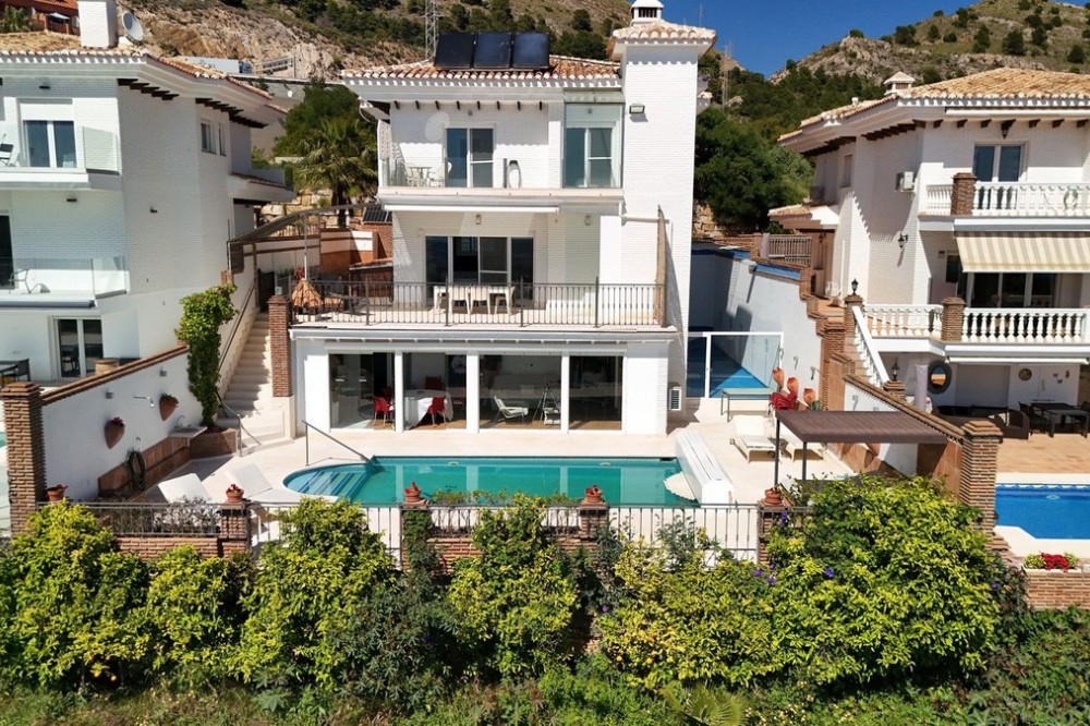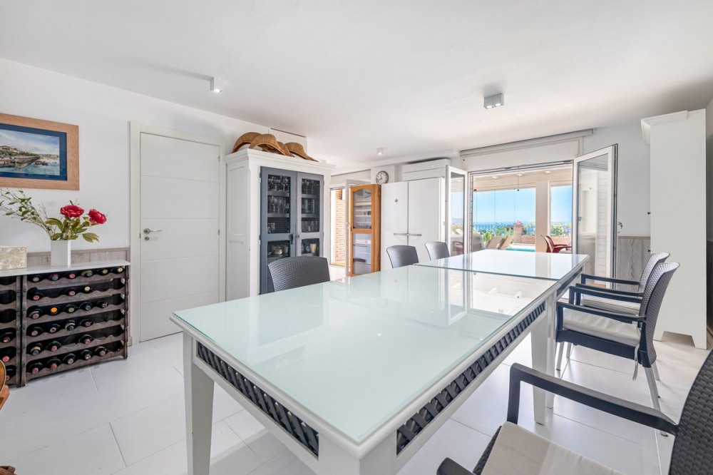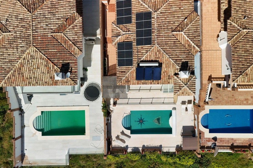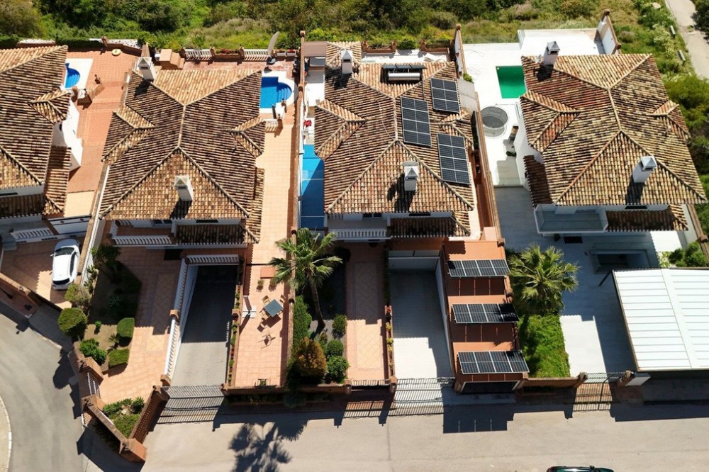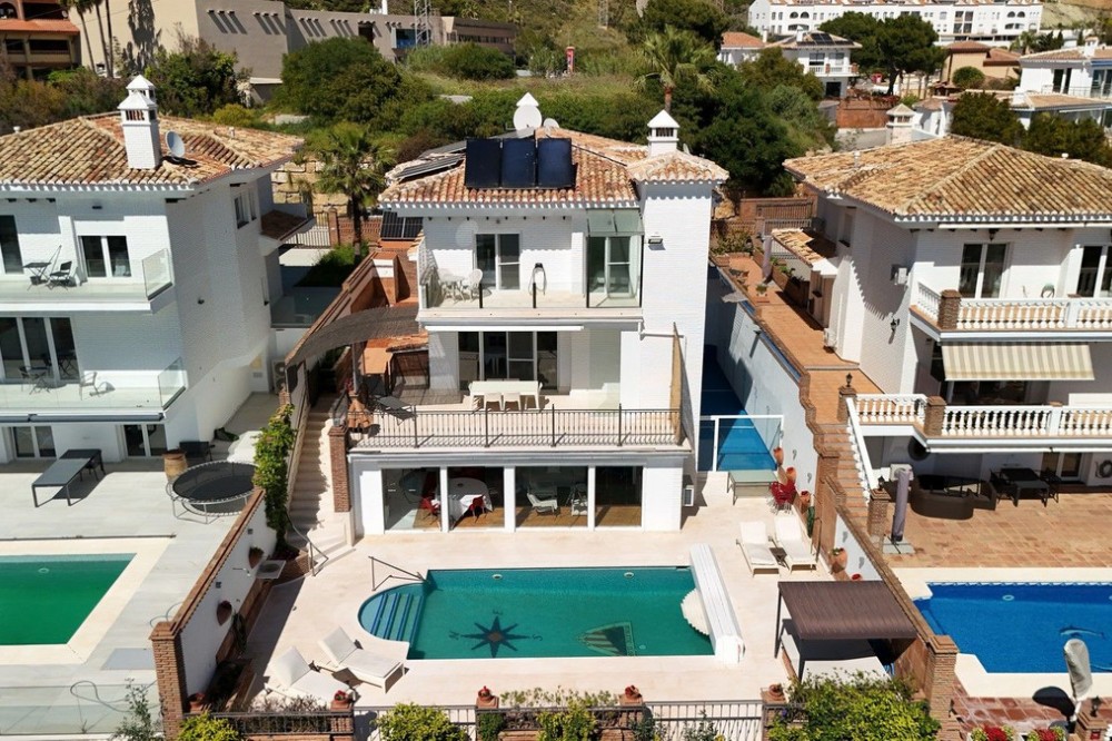• Villa in La Capellanía | Panoramic Views and High-End Fixtures This property, with a floor area of 294 m², sits on a 565 m² plot in the upper part of the La Capellanía residential development in Benalmádena. Built in 2013 and maintained by its original owner, the property stands out for its south-west facing orientation, ensuring constant natural light and unobstructed views towards Fuengirola Bay, the Mediterranean and the African coast. Layout and Connectivity The property is arranged over three levels connected by an internal staircase and a low-maintenance private lift linking the living areas to the pool area. Ground Floor: Living-dining room with a fireplace and a modern kitchen. The space opens onto a 40 m² main terrace protected by high-end electric awnings. Upper Floor: Four bedrooms and three bathrooms. The master suite features a 15 m² private terrace with views of the horizon. Ground Floor (Leisure Level): Designed for independent use, it has direct access from the outside without passing through the main house. It houses a high-end kitchen with a wine cellar, a fifth bedroom with an en-suite bathroom and a social area equipped with a professional Basque-style barbecue. Infrastructure and Sustainability The plot is fully landscaped with a paved finish for efficient maintenance. The outdoor area includes a heated saltwater swimming pool (9.50 m x 4.50 m) and a Basque pelota court. The technical specifications are designed for efficiency and comfort: Energy: Installation of photovoltaic panels and solar thermal panels for hot water. Large-capacity rainwater tank. Climate control: Independent Airzone system per room and underfloor heating in all bathrooms. Enclosures: Motorised security shutters and fly screens throughout the property. Parking and Extension: Enclosed pergola with automatic gate for two vehicles. Original garage currently used as a gym, with the technical feasibility to cover the ramp and extend the entrance platform. Location and Amenities Located a short walk from the shopping area (supermarket, pharmacy, restaurants) and public transport stops. Technical Specifications Floor area: 294 m² built / 565 m² plot. Bedrooms: 5. Bathrooms: 5 full bathrooms and 1 toilet. Key features: Lift, solar panels, heated saltwater swimming pool, professional barbecue and automated security system. Available for private viewings by appointment.
